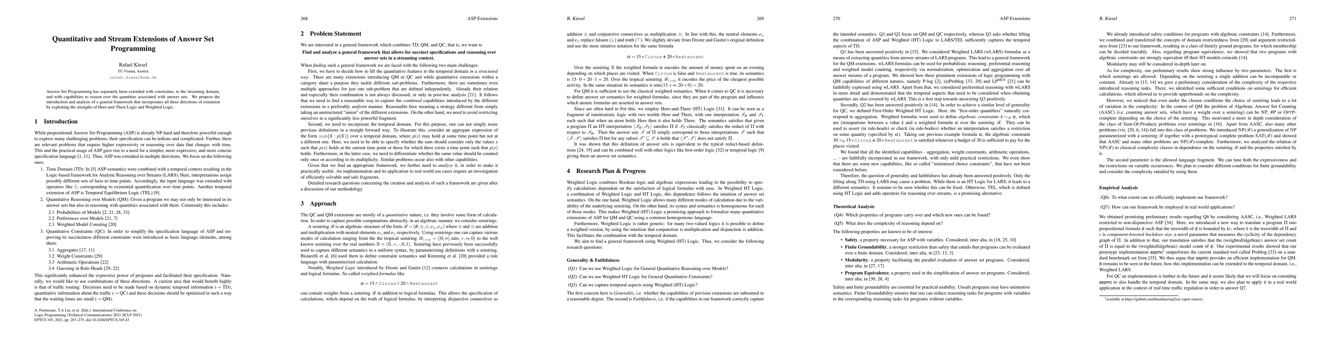 This research introduces a unified framework integrating Answer Set Programming with constraints, streaming, and quantity reasoning, leveraging Here-and-There Logic and Weighted Logic for enhanced capabilities.