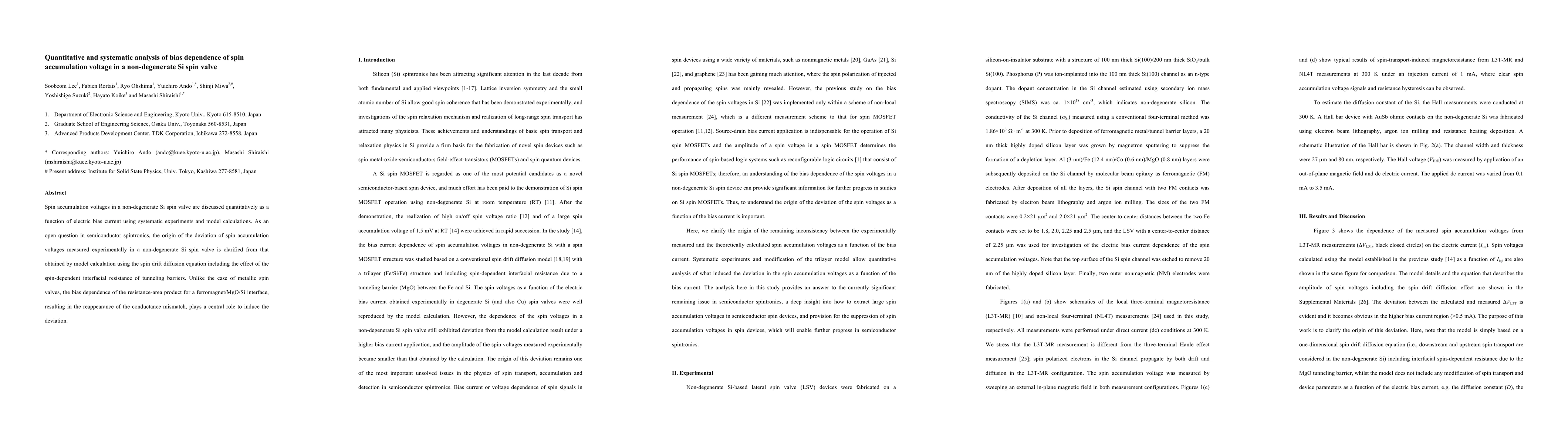 Spin accumulation voltages in a non-degenerate Si spin valve are discussed quantitatively as a function of electric bias current using systematic experiments and model calculations. As an open question in semiconductor spintronics, the origin of the deviation of spin accumulation voltages measured experimentally in a non-degenerate Si spin valve is clarified from that obtained by model calculation using the spin drift diffusion equation including the effect of the spin-dependent interfacial resistance of tunneling barriers. Unlike the case of metallic spin valves, the bias dependence of the resistance-area product for a ferromagnet/MgO/Si interface, resulting in the reappearance of the conductance mismatch, plays a central role to induce the deviation.