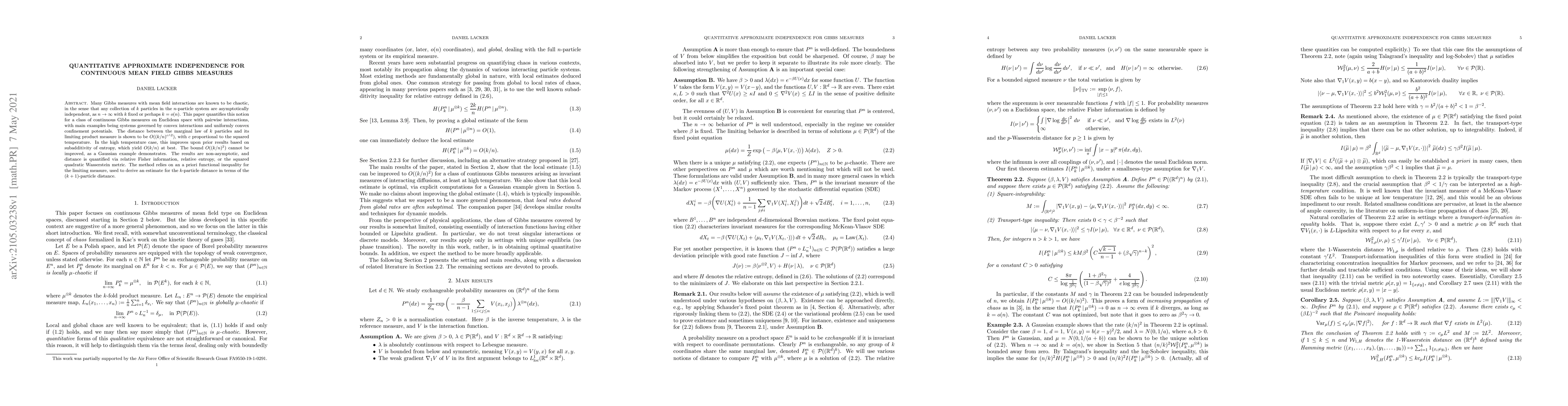 This paper quantifies the approximate independence of particles in continuous mean field Gibbs measures, showing that the distance between the marginal law of $k$ particles and its limiting product measure is $O((k/n)^{c \wedge 2})$, where $c$ is proportional to the squared temperature. The method uses an a priori functional inequality for the limiting measure to derive this result.