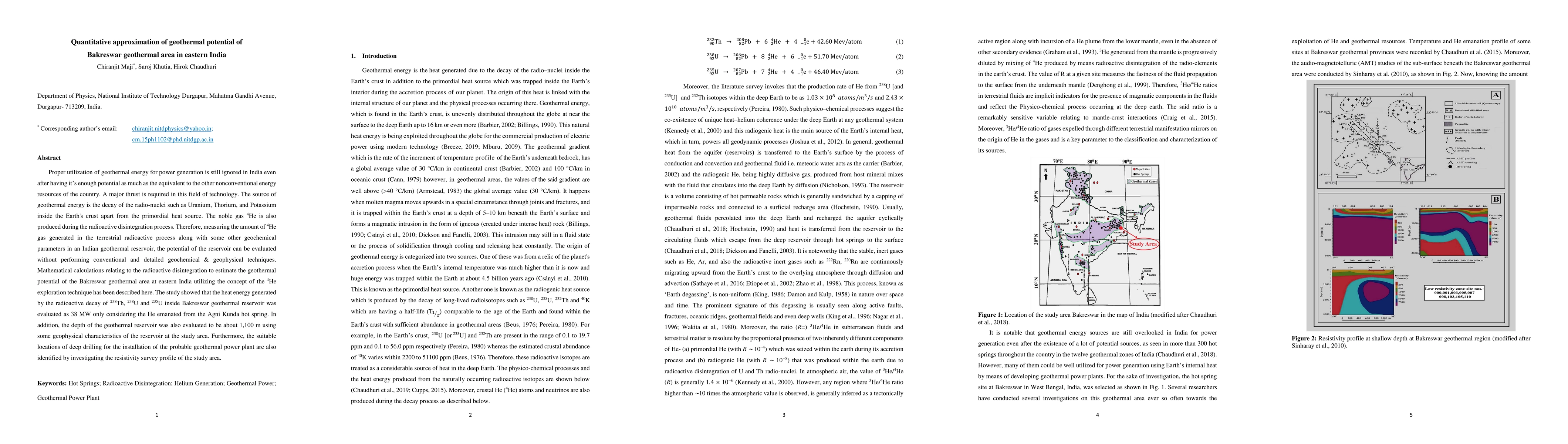 Proper utilization of geothermal energy for power generation is still ignored in India even after having it's enough potential as much as the equivalent to the other nonconventional energy resources of the country. A major thrust is required in this field of technology. The source of geothermal energy is the decay of the radio-nuclei, such as Uranium, Thorium, and Potassium inside the Earth's crust apart from the primordial heat source. The noble gas 4He is also produced during the radioactive disintegration process. Therefore, measuring the amount of 4He gas generated in the terrestrial radioactive process along with some other geochemical parameters in an Indian geothermal reservoir, the potential of the reservoir can be evaluated without performing conventional and detailed geochemical & geophysical techniques. Mathematical calculations relating to the radioactive disintegration to estimate the geothermal potential of the Bakreswar geothermal area at eastern India utilizing the concept of the 4He exploration technique has been described here. The study showed that the heat energy generated by the radioactive decay of 238Th, 238U and 235U inside Bakreswar geothermal reservoir was evaluated as 38 MW only considering the He emanated from the Agni Kunda hot spring. In addition, the depth of the geothermal reservoir was also evaluated to be about 1,100 m using some geophysical characteristics of the reservoir at the study area. Furthermore, the suitable locations of deep drilling for the installation of the probable geothermal power plant are also identified by investigating the resistivity survey profile of the study area.