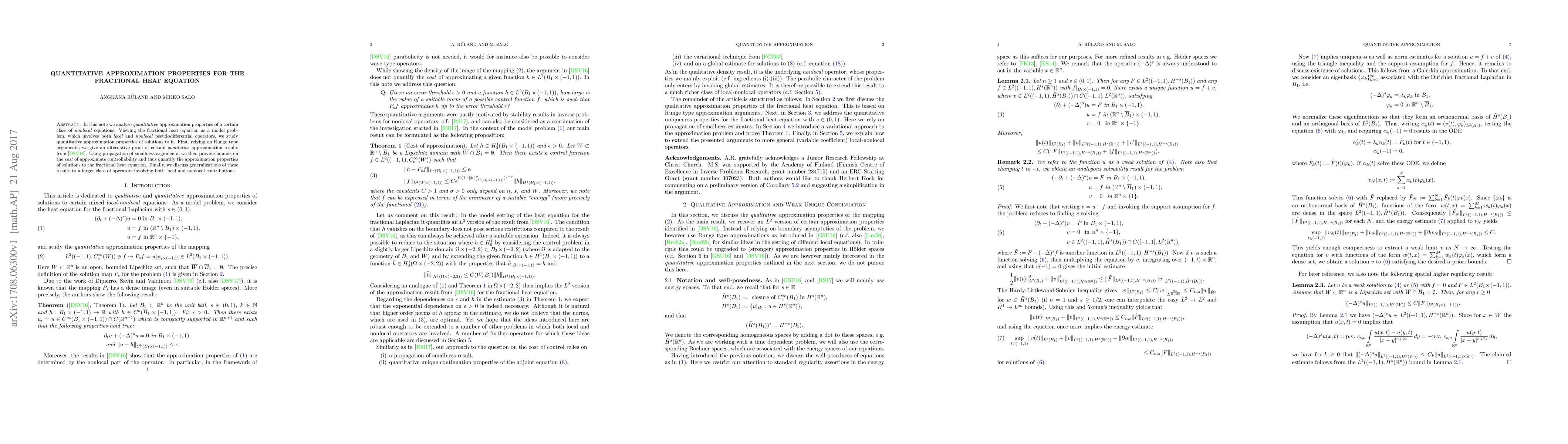 In this note we analyse \emph{quantitative} approximation properties of a certain class of \emph{nonlocal} equations: Viewing the fractional heat equation as a model problem, which involves both \emph{local} and \emph{nonlocal} pseudodifferential operators, we study quantitative approximation properties of solutions to it. First, relying on Runge type arguments, we give an alternative proof of certain \emph{qualitative} approximation results from \cite{DSV16}. Using propagation of smallness arguments, we then provide bounds on the \emph{cost} of approximate controllability and thus quantify the approximation properties of solutions to the fractional heat equation. Finally, we discuss generalizations of these results to a larger class of operators involving both local and nonlocal contributions.