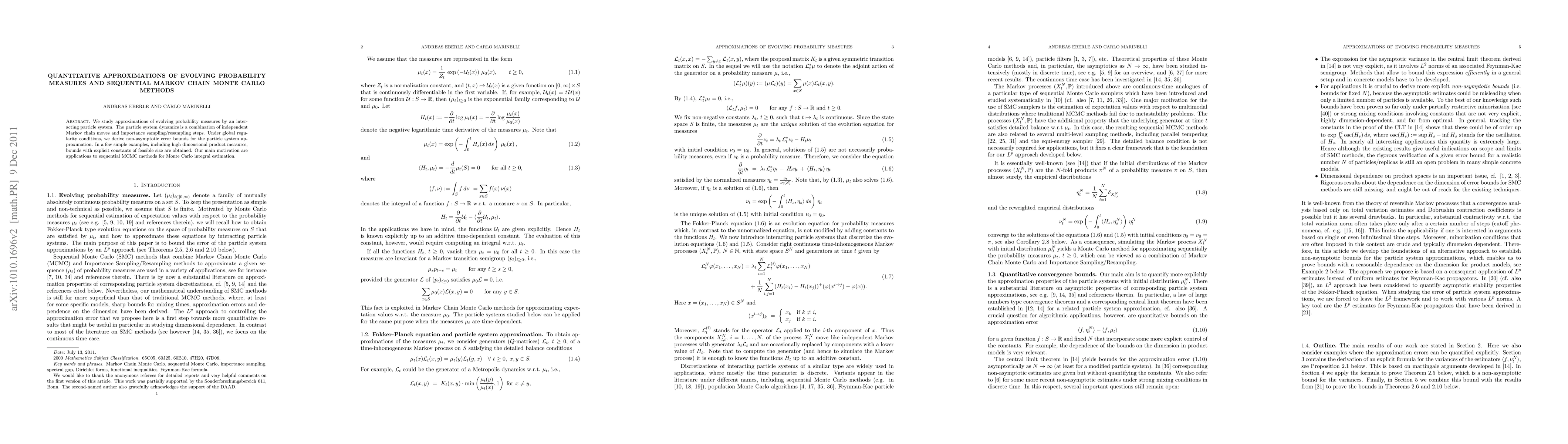 This paper develops quantitative approximations for evolving probability measures using an interacting particle system, combining Markov chain moves with importance sampling. It provides non-asymptotic error bounds under global regularity conditions and applies these methods to improve sequential Markov Chain Monte Carlo (MCMC) techniques for Monte Carlo integral estimation.