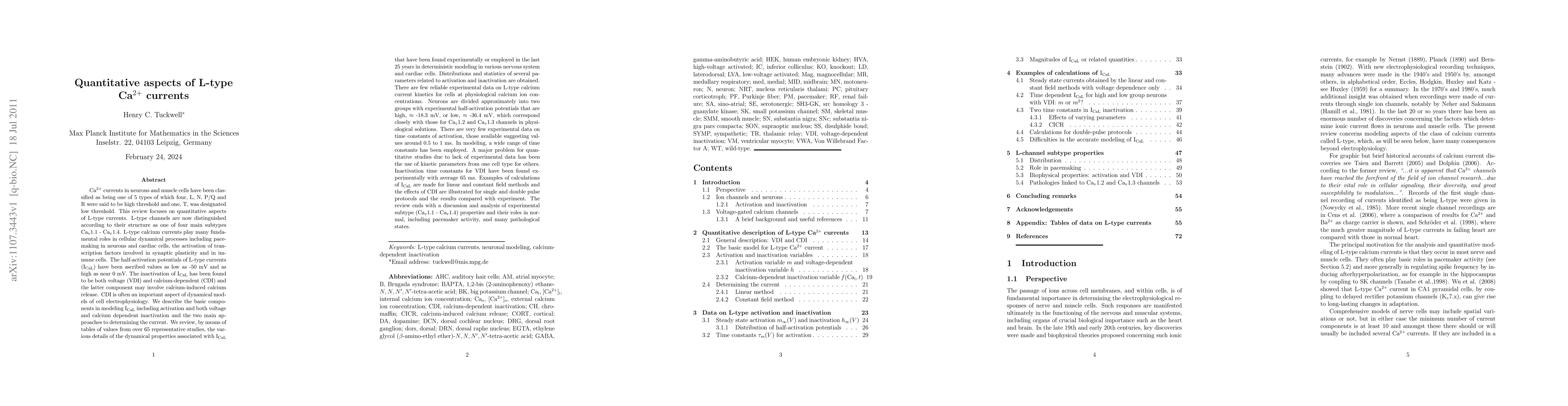 Calcium currents in neurons and muscle cells have been classified as being one of 5 types of which four, L, N, P/Q and R were said to be high threshold and one, T, was designated low threshold. This review focuses on quantitative aspects of L-type currents. L-type channels are now distinguished according to their structure as one of four main subtypes 1.1-1.4. L-type calcium currents play many fundamental roles in cellular dynamical processes including pacemaking in neurons and cardiac cells, the activation of transcription factors involved in synaptic plasticity and in immune cells. The half-activation potentials of L-type currents have been ascribed values as low as -50 mV and as high as near 0 mV. The inactivation of I_L has been found to be both voltage (VDI) and calcium-dependent (CDI) and the latter component may involve calcium-induced calcium release. CDI is often an important aspect of dynamical models of cell electrophysiology. We describe the basic components in modeling I_L including activation and both voltage and calcium dependent inactivation and the two main approaches to determining the current. We review, by means of tables of values from over 65 representative studies, the various details of the dynamical properties associated with I_L that have been found experimentally or employed in the last 25 years in deterministic modeling in various nervous system and cardiac cells. Distributions and statistics of several parameters related to activation and inactivation are obtained. There are few reliable experimental data on L-type calcium current kinetics for cells at physiological calcium ion concentrations. Neurons are divided approximately into two groups with experimental half-activation potentials.