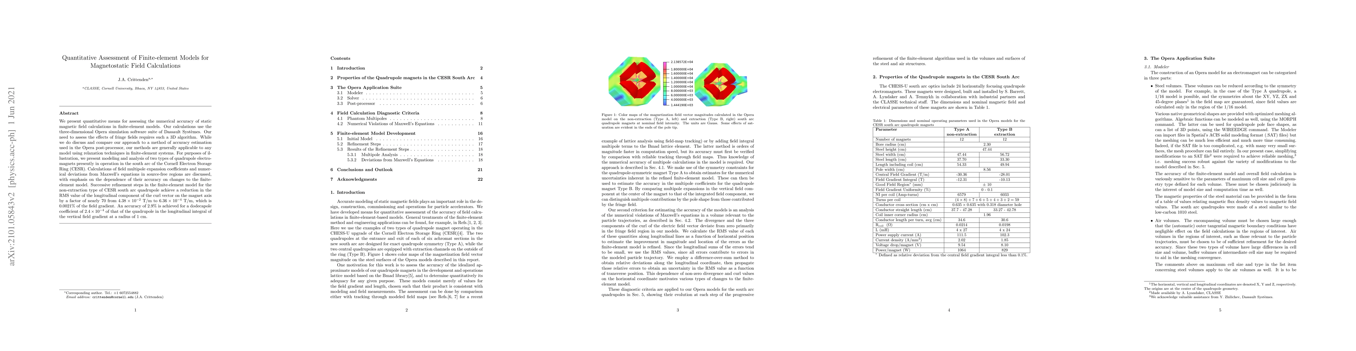 We present quantitative means for assessing the numerical accuracy of static magnetic field calculations in finite-element models. Our calculations use the three-dimensional Opera simulation software suite of Dassault Syst`emes. Our need to assess the effects of fringe fields requires such a 3D algorithm. While we do discuss and compare our approach to a method of accuracy estimation used in the Opera post-processor, our methods are generally applicable to any model using relaxation techniques in finite-element systems. For purposes of illustration, we present modeling and analysis of two types of quadrupole electromagnets presently in operation in the south arc of the Cornell Electron Storage Ring (CESR). Calculations of field multipole expansion coefficients and numerical deviations from Maxwell's equations in source-free regions are discussed, with emphasis on the dependence of their accuracy on changes to the finite-element model. Successive refinement steps in the finite-element model for the non-extraction type of CESR south arc quadrupole achieve a reduction in the RMS value of the longitudinal component of the curl vector on the magnet axis by a factor of nearly 70 from $4.38 \times 10^{-2}$ T/m to $6.36 \times 10^{-4}$ T/m, which is 0.0021% of the field gradient. An accuracy of 2.9% is achieved for a dodecapole coefficient of $2.4 \times 10^{-4}$ of that of the quadrupole in the longitudinal integral of the vertical field gradient at a radius of 1 cm.