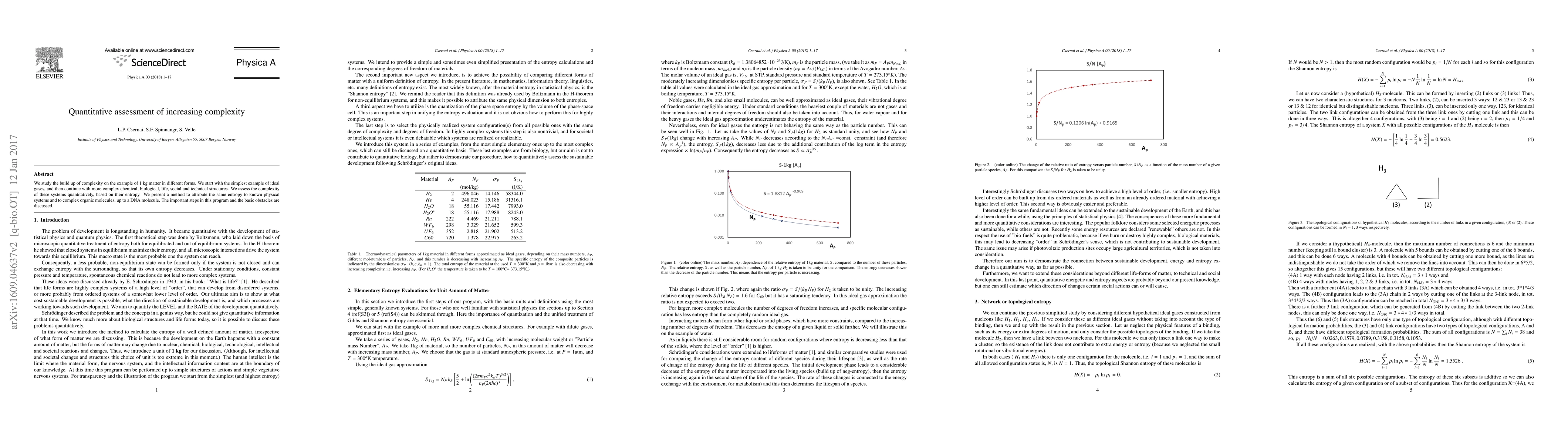 We study the build up of complexity on the example of 1 kg matter in different forms. We start on the simplest example of ideal gases, and then continue with more complex chemical, biological, life and social and technical structures. We assess the complexity of these systems quantitatively, based on their entropy. We present a method to attribute the same entropy to known physical systems and to complex organic molecules up to a DNA. The important steps in this program and the basic obstacles are discussed.