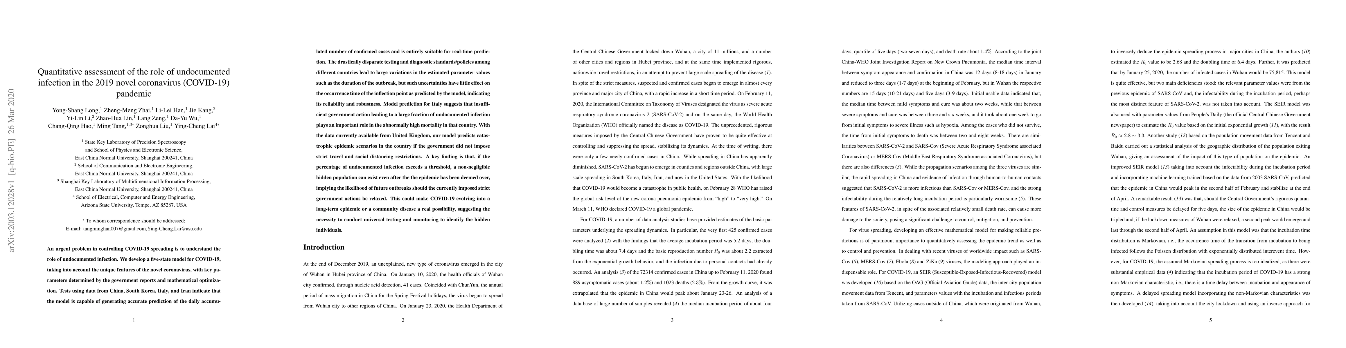 An urgent problem in controlling COVID-19 spreading is to understand the role of undocumented infection. We develop a five-state model for COVID-19, taking into account the unique features of the novel coronavirus, with key parameters determined by the government reports and mathematical optimization. Tests using data from China, South Korea, Italy, and Iran indicate that the model is capable of generating accurate prediction of the daily accumulated number of confirmed cases and is entirely suitable for real-time prediction. The drastically disparate testing and diagnostic standards/policies among different countries lead to large variations in the estimated parameter values such as the duration of the outbreak, but such uncertainties have little effect on the occurrence time of the inflection point as predicted by the model, indicating its reliability and robustness. Model prediction for Italy suggests that insufficient government action leading to a large fraction of undocumented infection plays an important role in the abnormally high mortality in that country. With the data currently available from United Kingdom, our model predicts catastrophic epidemic scenarios in the country if the government did not impose strict travel and social distancing restrictions. A key finding is that, if the percentage of undocumented infection exceeds a threshold, a non-negligible hidden population can exist even after the the epidemic has been deemed over, implying the likelihood of future outbreaks should the currently imposed strict government actions be relaxed. This could make COVID-19 evolving into a long-term epidemic or a community disease a real possibility, suggesting the necessity to conduct universal testing and monitoring to identify the hidden individuals.