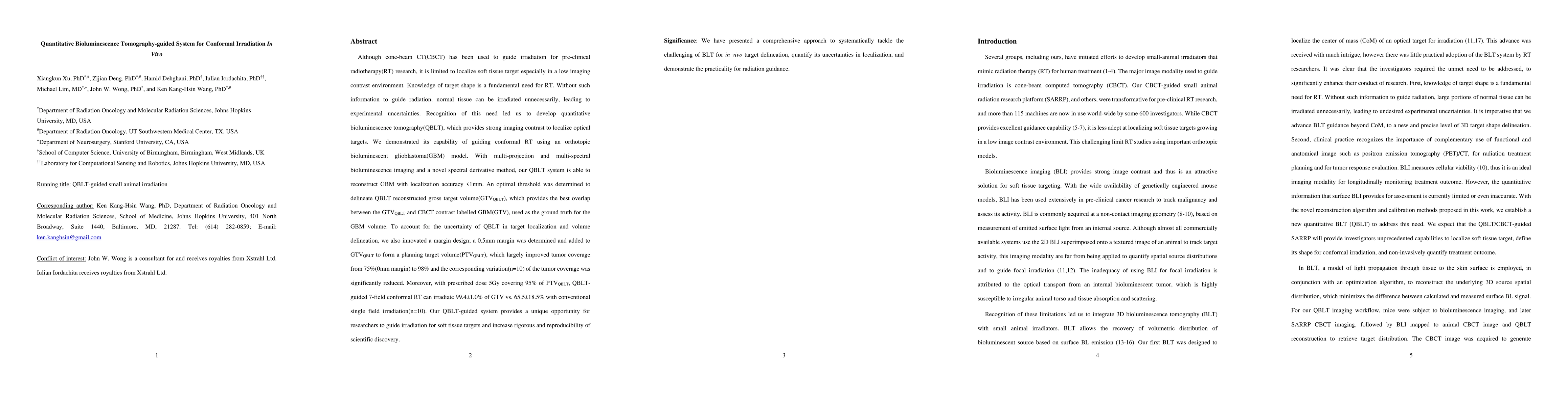 This paper introduces a quantitative bioluminescence tomography (QBLT) system to guide conformal irradiation in pre-clinical radiotherapy research, demonstrating its ability to localize soft tissue targets with high accuracy. The QBLT system significantly improves tumor coverage and irradiation precision compared to conventional methods.