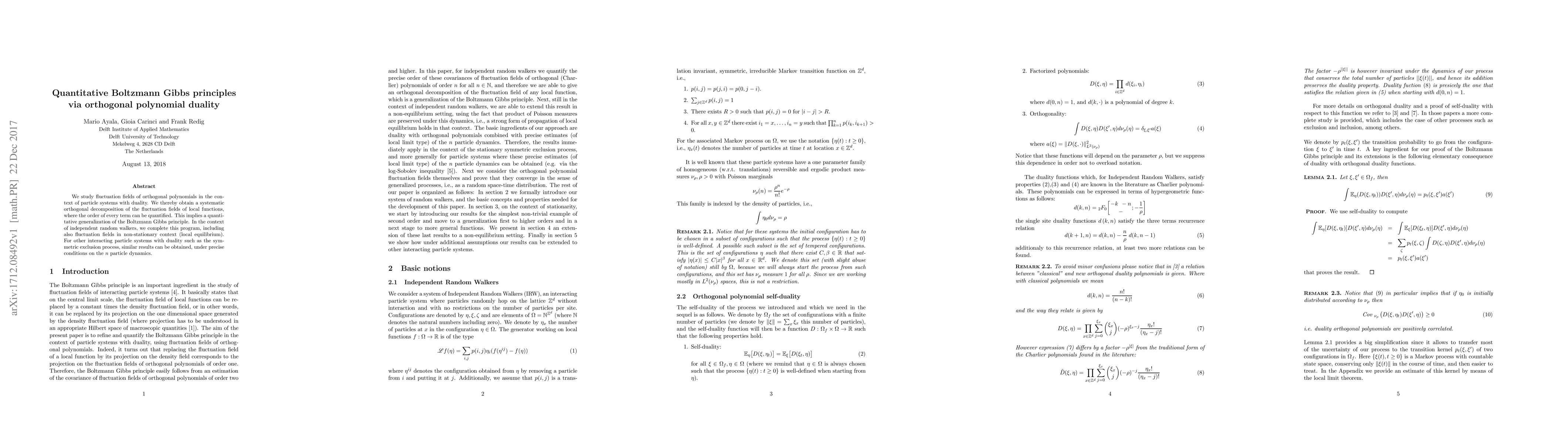 We study fluctuation fields of orthogonal polynomials in the context of particle systems with duality. We thereby obtain a systematic orthogonal decomposition of the fluctuation fields of local functions, where the order of every term can be quantified. This implies a quantitative generalization of the Boltzmann Gibbs principle. In the context of independent random walkers, we complete this program, including also fluctuation fields in non-stationary context (local equilibrium). For other interacting particle systems with duality such as the symmetric exclusion process, similar results can be obtained, under precise conditions on the $n$ particle dynamics