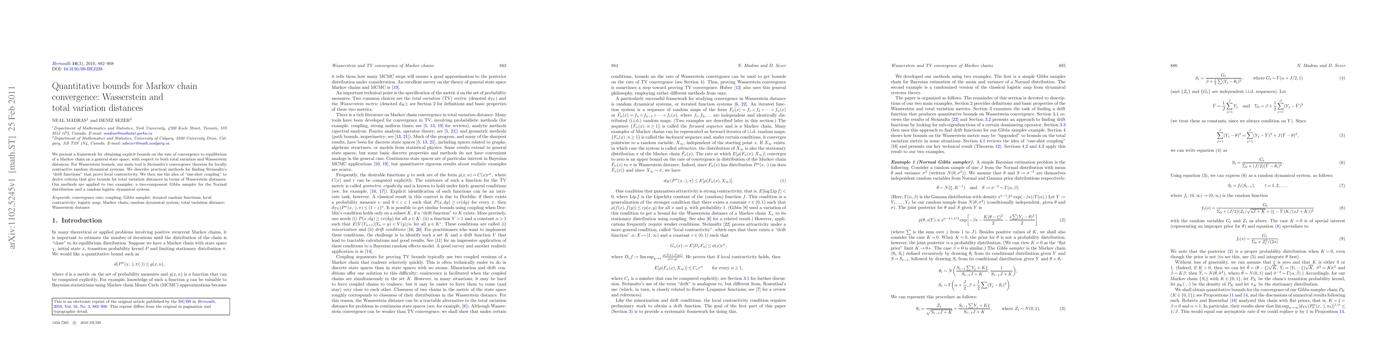 This paper provides explicit convergence bounds for Markov chains using both total variation and Wasserstein distances, leveraging Steinsaltz's convergence theorem and "one-shot coupling" techniques. Practical methods for identifying drift functions and applying these bounds are demonstrated through examples of a Gibbs sampler and a random logistic system.