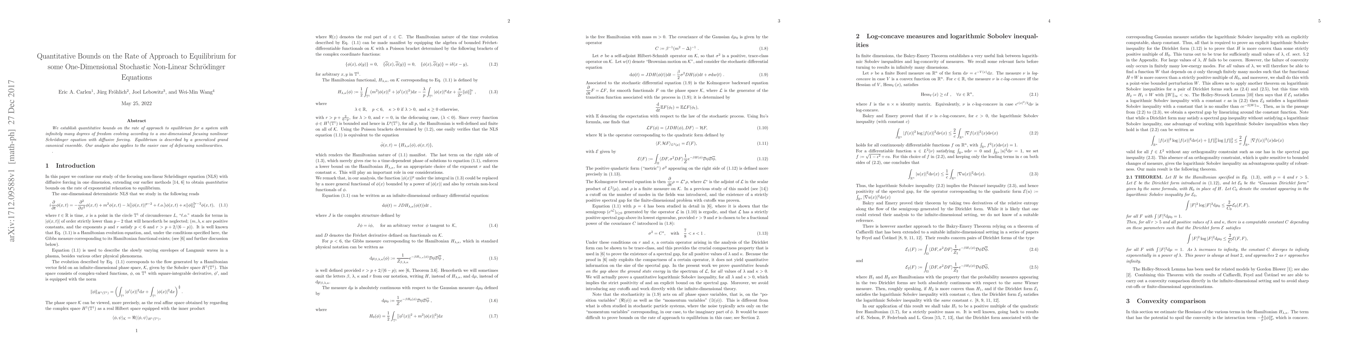 Researchers established quantitative bounds on how quickly a complex system approaches equilibrium in one-dimensional nonlinear Schr"odinger equations with diffusive forcing. This finding applies to systems with infinitely many degrees of freedom.