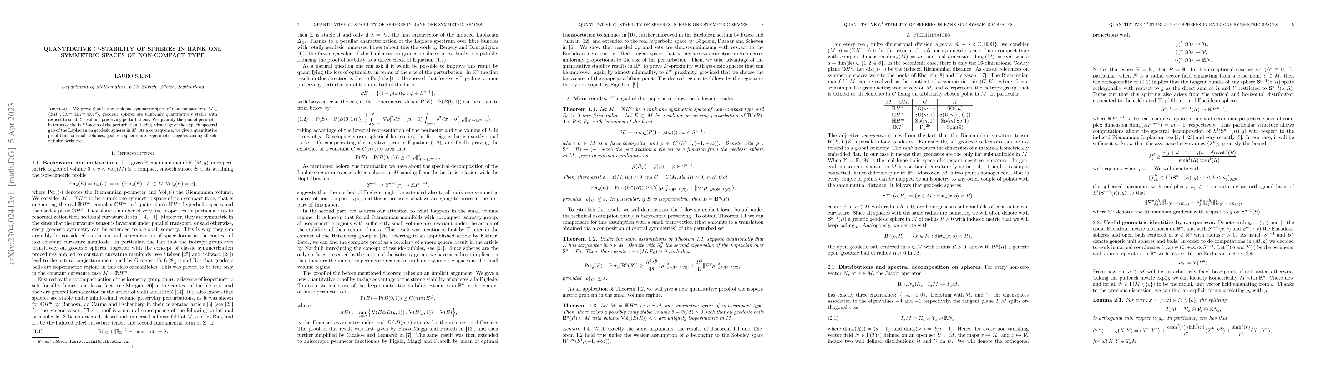 This paper proves the quantitative $C^1$-stability of geodesic spheres in various rank one symmetric spaces of non-compact type, demonstrating that small volume-preserving perturbations result in a predictable gain in perimeter, quantified via the $W^{1,2}$-norm of the perturbation. The study leverages the explicit spectral gap of the Laplacian to establish that geodesic spheres are isoperimetric for small volumes.