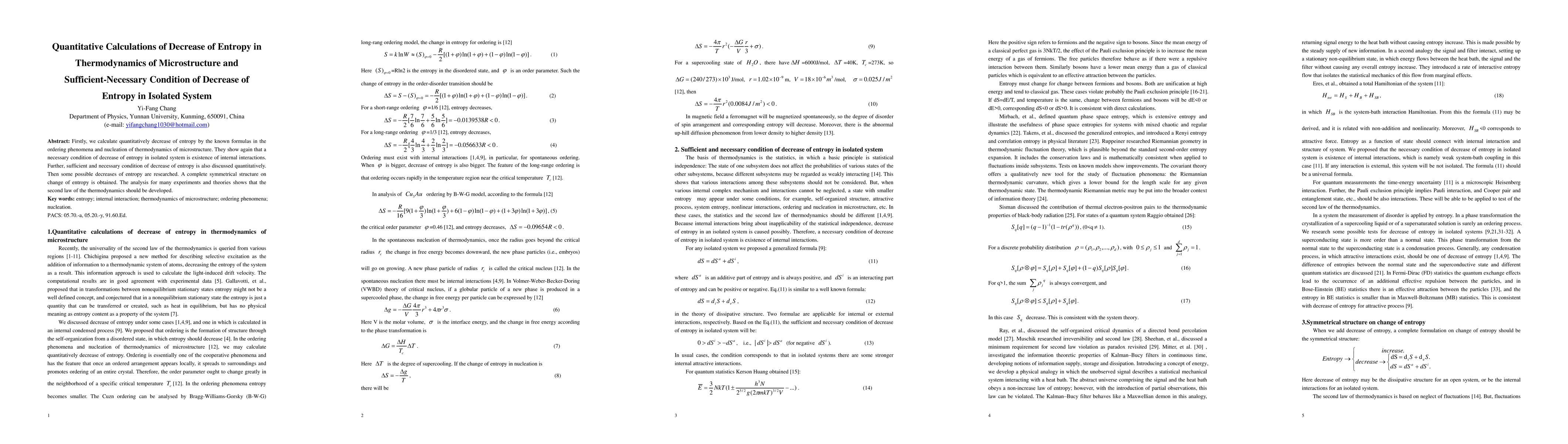 This paper quantitatively analyzes the decrease of entropy in thermodynamic microstructures, demonstrating that internal interactions are necessary for entropy reduction in isolated systems. It also explores the sufficient and necessary conditions for entropy decrease and proposes a symmetrical structure for entropy change, suggesting a need for the development of the second law of thermodynamics.