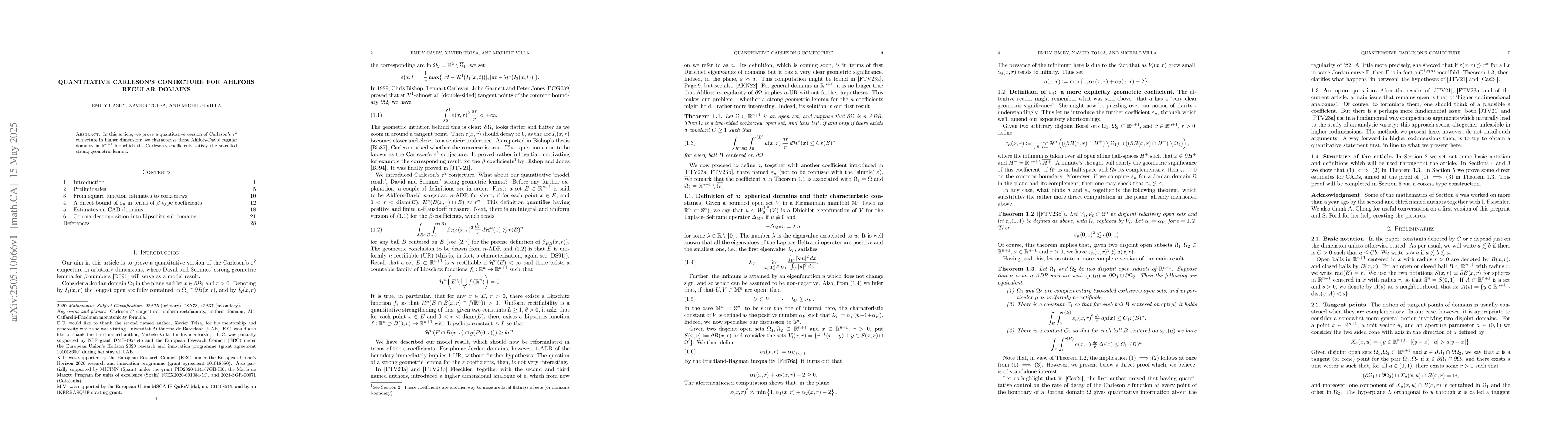 The development of a novel approach to prove a quantitative Carleson's conjecture for Ahlfors regular domains, combining geometric measure theory and harmonic analysis techniques.