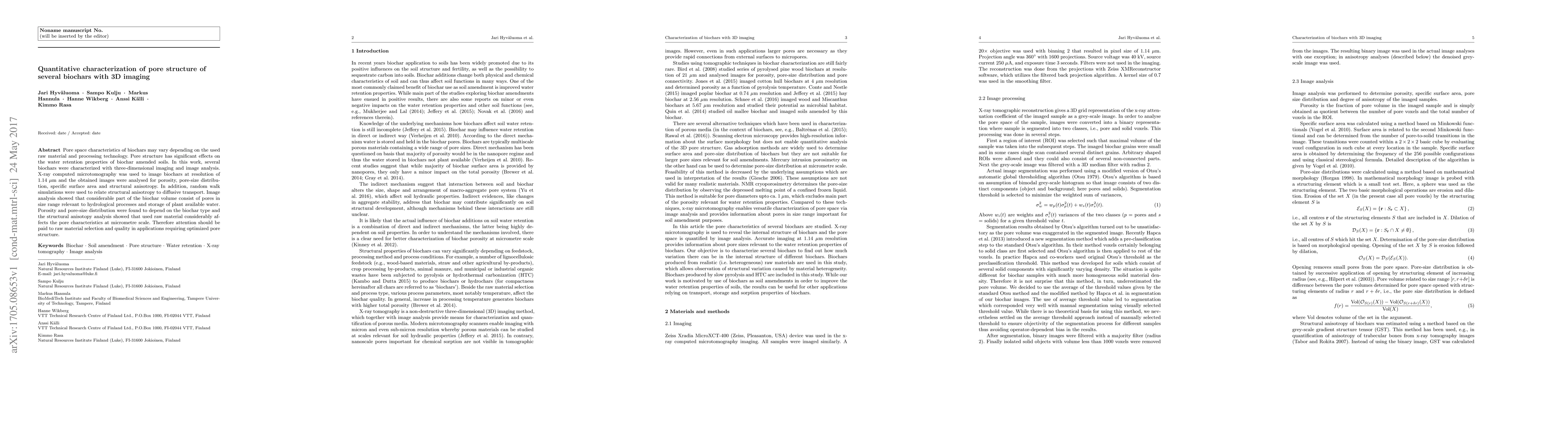 This study uses 3D imaging to characterize the pore structure of various biochars, revealing significant variations in porosity, pore size distribution, and structural anisotropy based on raw material and processing methods. The findings emphasize the importance of raw material selection for optimizing biochar's water retention and diffusive transport properties.