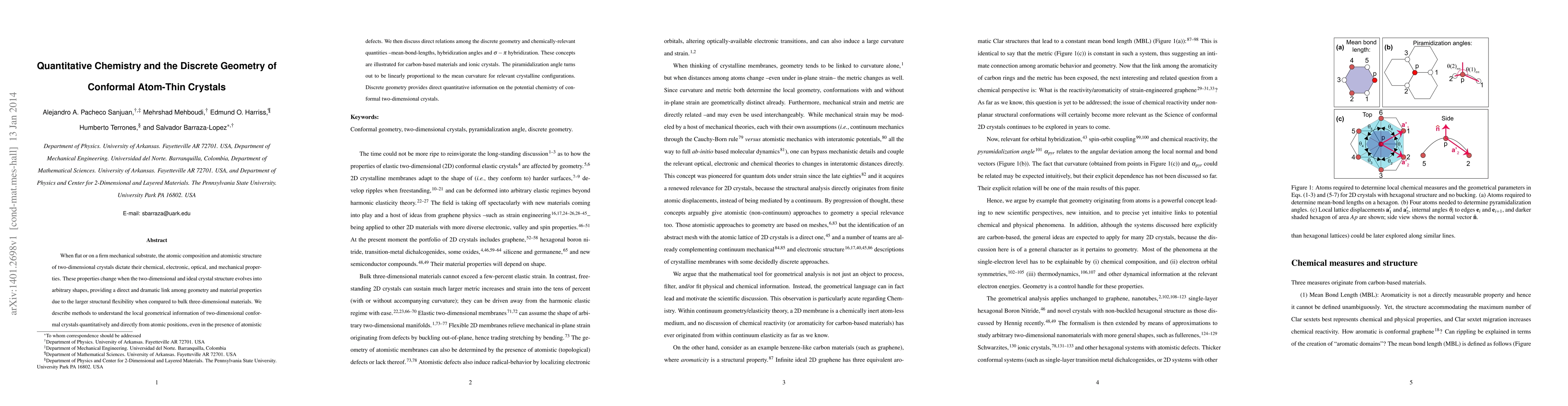 This paper explores quantitative methods to analyze the geometry of two-dimensional conformal crystals, linking their atomic structure to chemical and physical properties. It demonstrates a direct correlation between discrete geometry and chemical quantities like mean-bond-lengths and hybridization angles, illustrated through carbon-based materials and ionic crystals.