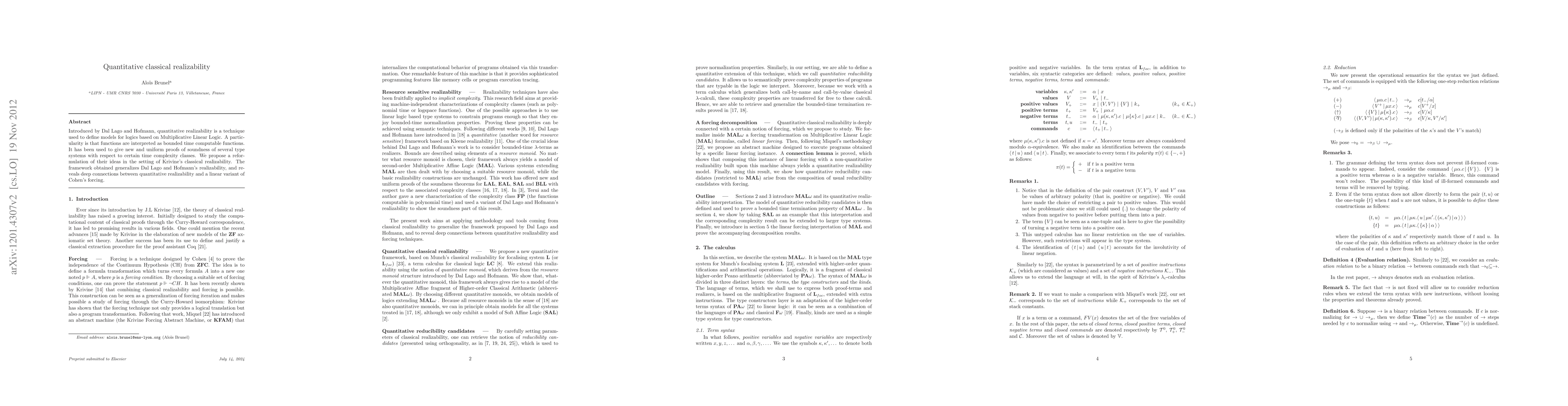 This paper reformulates quantitative realizability within Krivine's classical realizability, generalizing previous work and uncovering deep links between this framework and a linear variant of Cohen's forcing, providing new insights into the soundness of type systems with respect to time complexity classes.