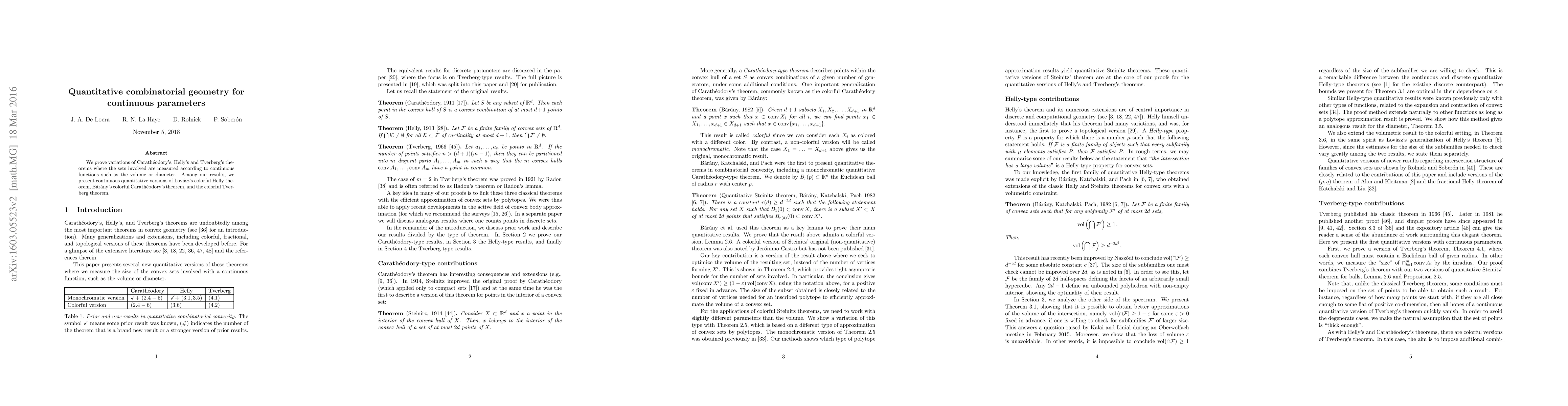 This paper proves quantitative versions of several geometric theorems, including Lovasz's colorful Helly theorem and Caratheodory's theorem, using continuous functions such as volume or diameter to measure sets.