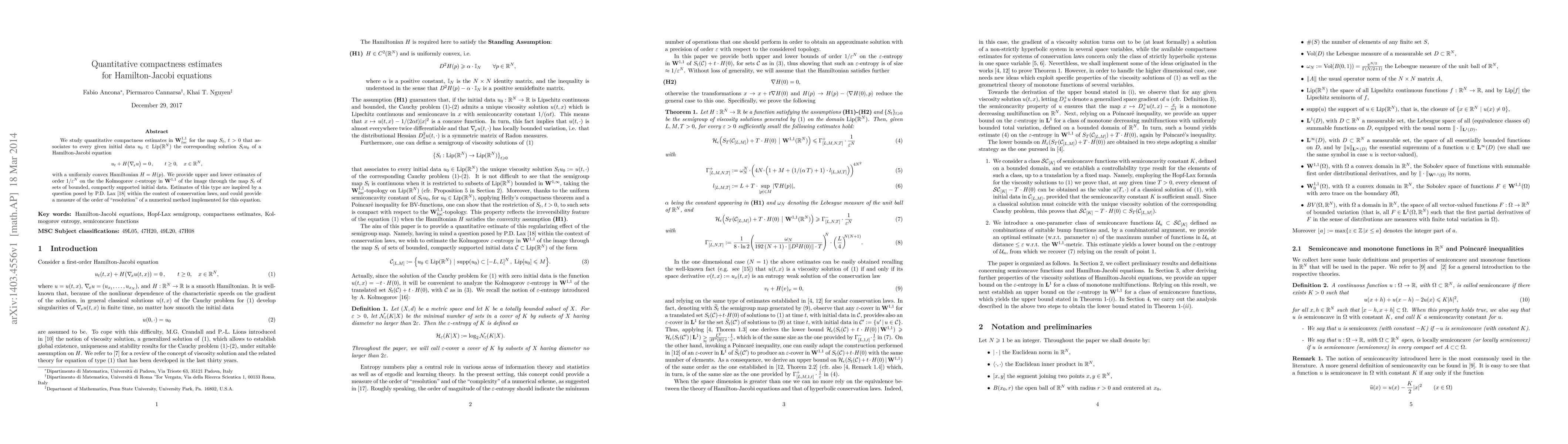 This paper investigates quantitative compactness estimates for solutions of Hamilton-Jacobi equations, providing upper and lower bounds on the Kolmogorov $\varepsilon$-entropy in $\mathbf{W}^{1,1}$ for the map associating initial data to solutions. These estimates could measure the resolution of numerical methods for these equations.