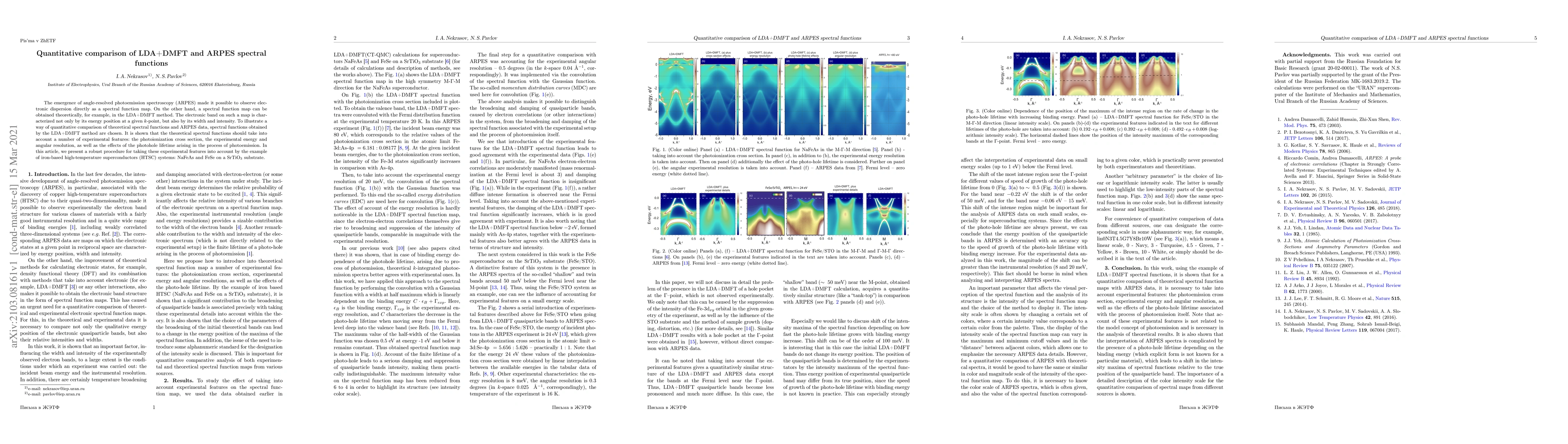 The emergence of angle-resolved photoemission spectroscopy (ARPES) made it possible to observe electronic dispersion directly as a spectral function map. On the other hand, a spectral function map can be obtained theoretically, for example, in the LDA+DMFT method. The electronic band on such a map is characterized not only by its energy position at a given $k$-point, but also by its width and intensity. To illustrate a way of quantitative comparison of theoretical spectral functions and ARPES data, spectral functions obtained by the LDA+DMFT method are chosen. It is shown that the theoretical spectral functions should take into account a number of experimental features: the photoionization cross section, the experimental energy and angular resolution, as well as the effects of the photohole lifetime arising in the process of photoemission. In this article, we present a robust procedure for taking these experimental features into account by the example of iron-based high-temperature superconductors (HTSC) systems: NaFeAs and FeSe on a SrTiO$_3$ substrate.