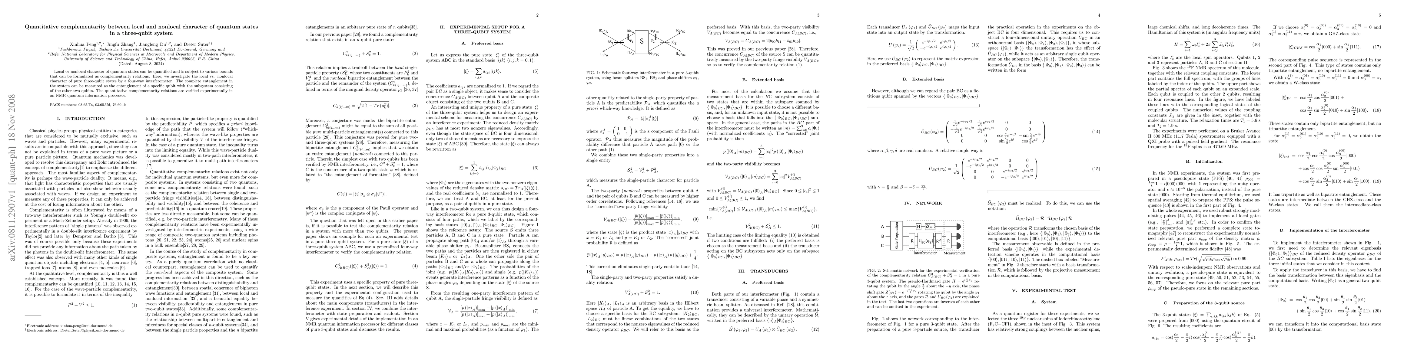 This paper investigates the complementarity between local and nonlocal characteristics of pure three-qubit quantum states using a four-way interferometer. The study verifies quantitative complementarity relations experimentally in an NMR quantum information processor, demonstrating the complete entanglement in the system.