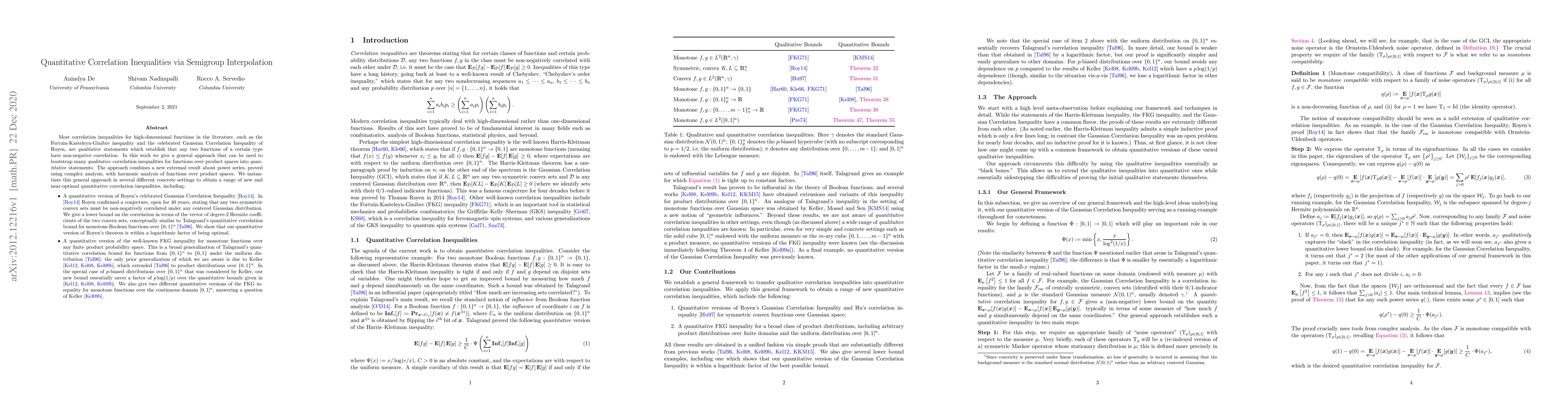 This paper develops a novel method to convert qualitative correlation inequalities into quantitative ones using semigroup interpolation and complex analysis. It provides quantitative versions of Royen's Gaussian Correlation Inequality and the FKG inequality, establishing bounds on correlations in terms of specific function properties.