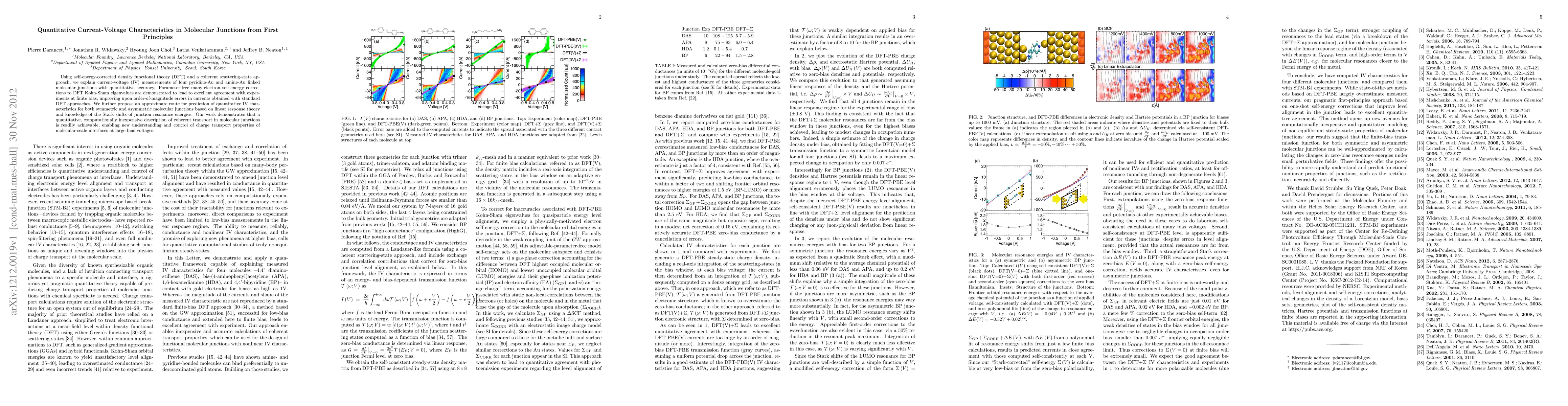 The paper utilizes self-energy-corrected density functional theory to quantitatively describe current-voltage characteristics in pyridine-Au and amine-Au molecular junctions, achieving precise agreement with experimental measurements. It proposes a method for predicting IV characteristics based on linear response theory and Stark shifts, demonstrating a computationally efficient way to understand charge transport in molecular interfaces.