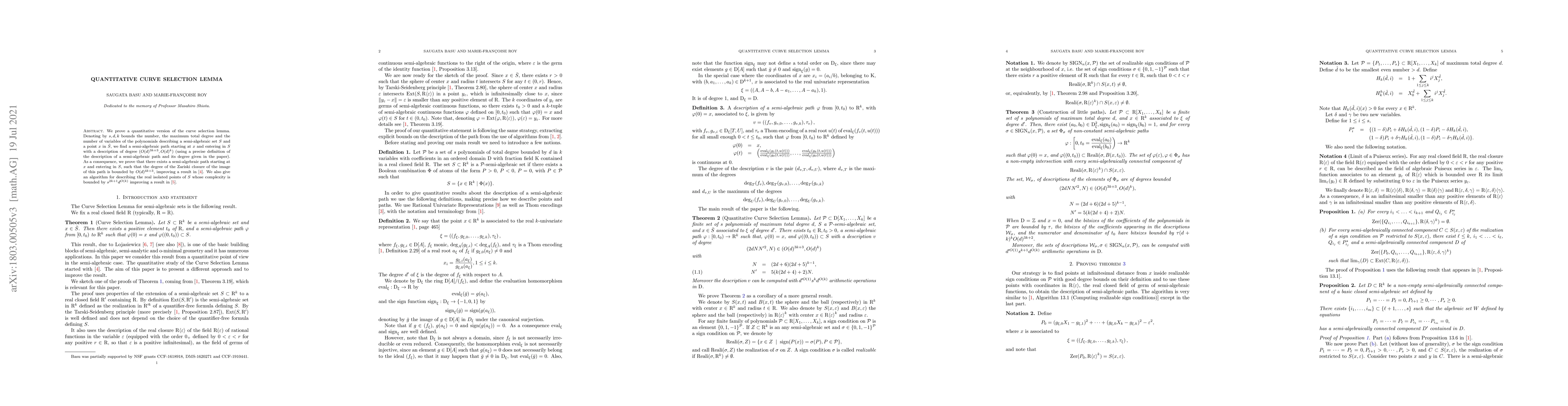 This paper proves a quantitative version of the curve selection lemma, allowing for efficient semi-algebraic path construction in semi-algebraic sets. It also provides an algorithm for describing real isolated points with improved complexity bounds.