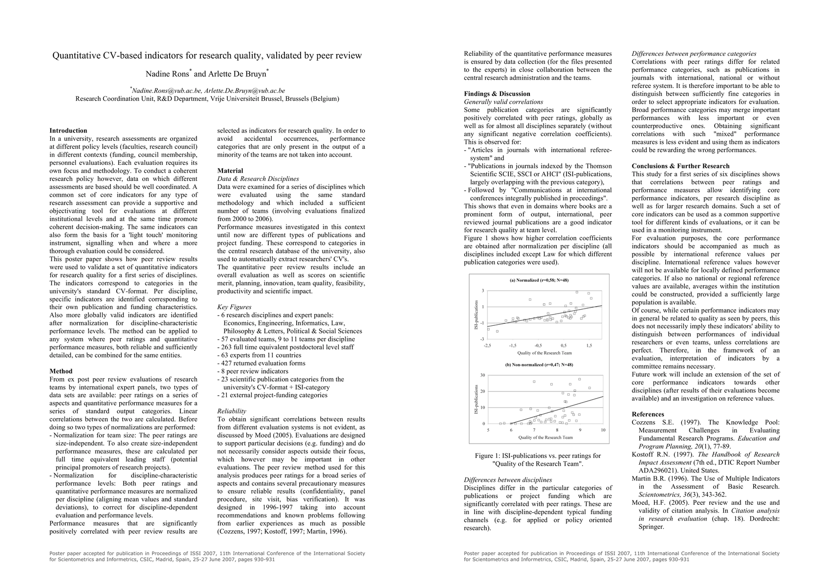 In a university, research assessments are organized at different policy levels (faculties, research council) in different contexts (funding, council membership, personnel evaluations). Each evaluation requires its own focus and methodology. To conduct a coherent research policy however, data on which different assessments are based should be well coordinated. A common set of core indicators for any type of research assessment can provide a supportive and objectivating tool for evaluations at different institutional levels and at the same time promote coherent decision-making. The same indicators can also form the basis for a 'light touch' monitoring instrument, signalling when and where a more thorough evaluation could be considered. This poster paper shows how peer review results were used to validate a set of quantitative indicators for research quality for a first series of disciplines. The indicators correspond to categories in the university's standard CV-format. Per discipline, specific indicators are identified corresponding to their own publication and funding characteristics. Also more globally valid indicators are identified after normalization for discipline-characteristic performance levels. The method can be applied to any system where peer ratings and quantitative performance measures, both reliable and sufficiently detailed, can be combined for the same entities.