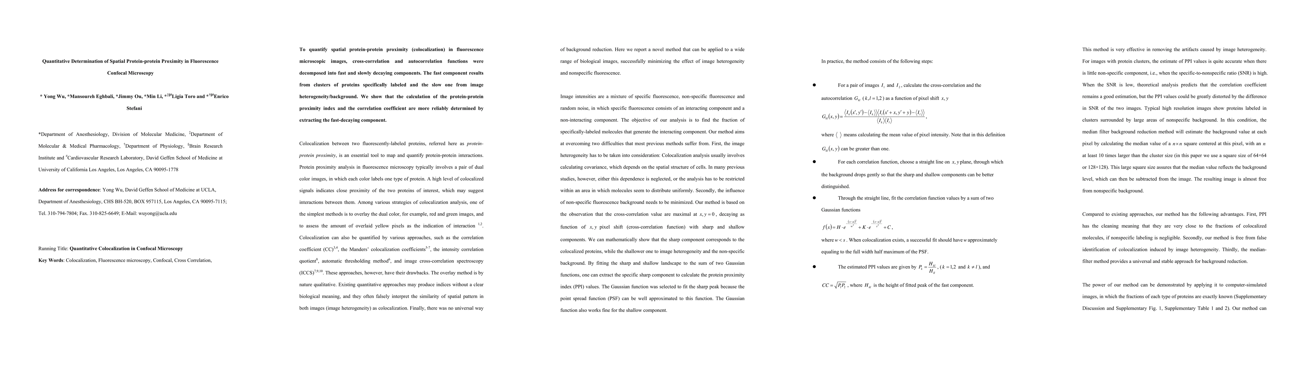 To quantify spatial protein-protein proximity (colocalization) in fluorescence microscopic images, cross-correlation and autocorrelation functions were decomposed into fast and slowly decaying components. The fast component results from clusters of proteins specifically labeled and the slow one from background/image heterogeneity. We show that the calculation of the protein-protein proximity index and the correlation coefficient are more reliably determined by extracting the fast-decaying component.