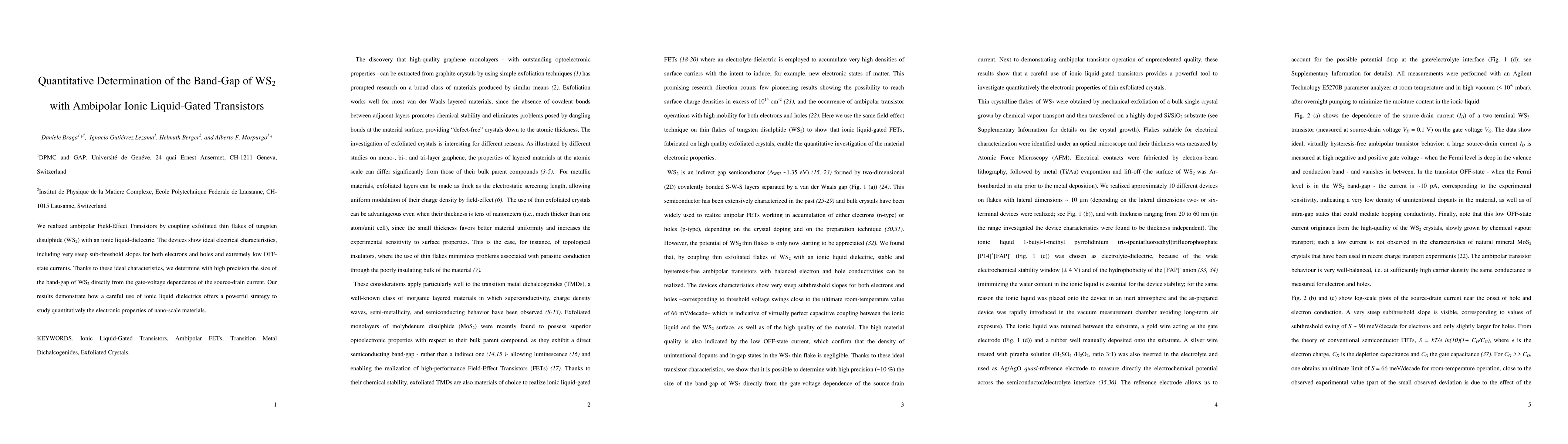 This paper reports on the precise determination of the band-gap of WS2 using ambipolar ionic liquid-gated Field-Effect Transistors, showcasing ideal electrical characteristics and low OFF-state currents, thereby demonstrating the effectiveness of ionic liquid dielectrics for studying nano-scale materials.