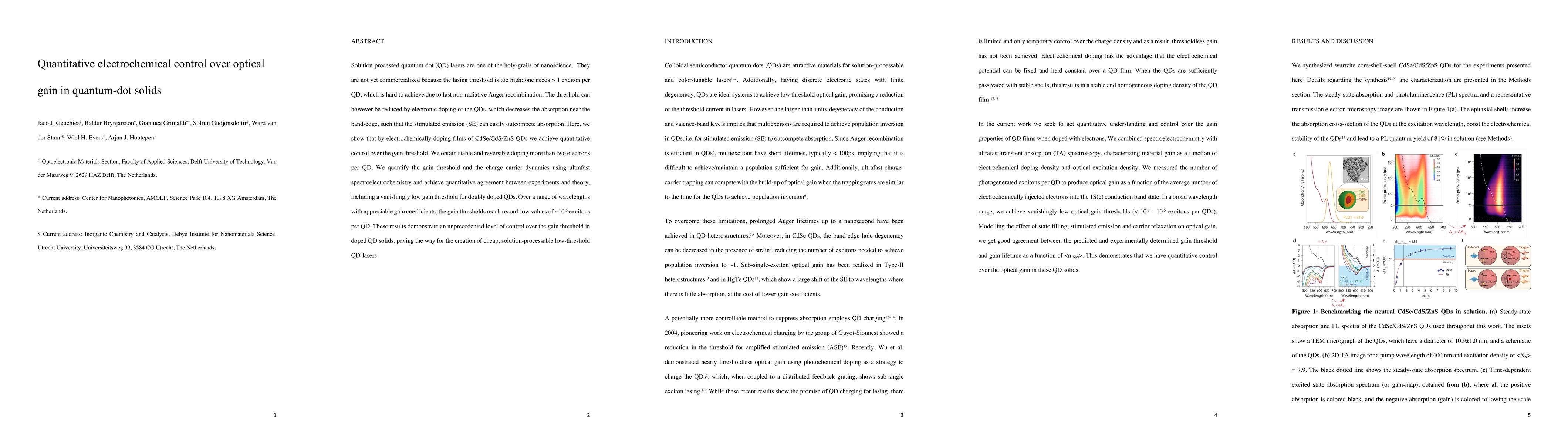 This paper demonstrates quantitative electrochemical control over optical gain in quantum-dot solids, achieving record-low gain thresholds of ~10^-5 excitons per quantum dot through reversible doping of CdSe/CdS/ZnS quantum dots. This method paves the way for the development of low-threshold, solution-processable quantum-dot lasers.