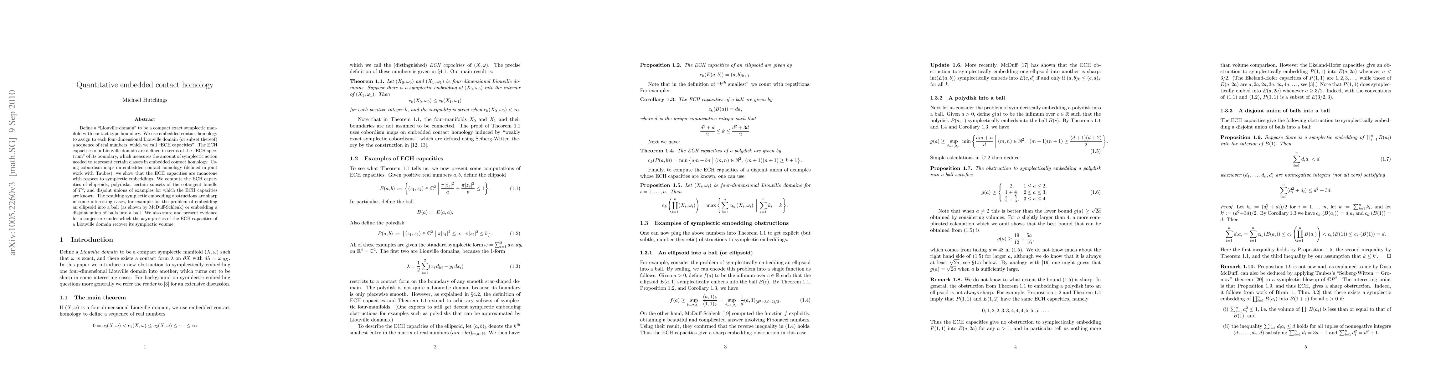 This paper introduces "ECH capacities" for four-dimensional Liouville domains, defined via embedded contact homology, and demonstrates their monotonicity under symplectic embeddings. It computes these capacities for various geometric structures and shows they provide sharp obstructions for embedding problems, hinting at a conjecture linking these capacities to the symplectic volume.