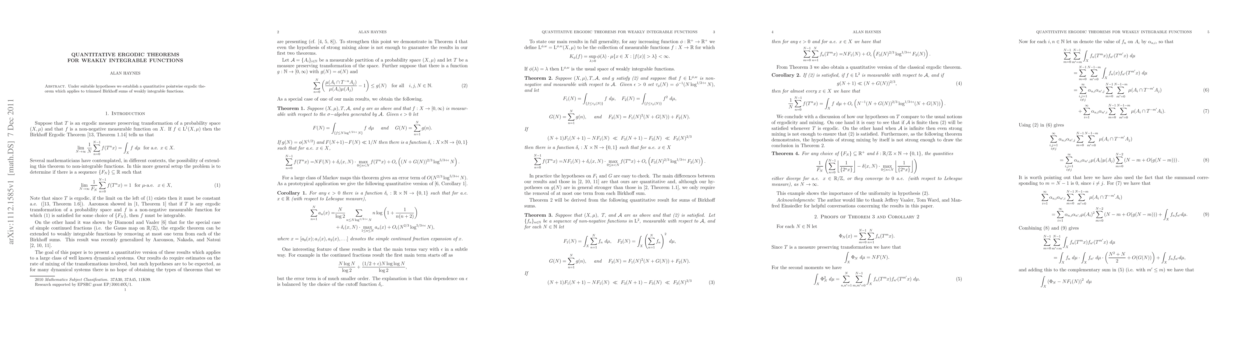 The paper establishes quantitative pointwise ergodic theorems for trimmed Birkhoff sums of weakly integrable functions under specific hypotheses.