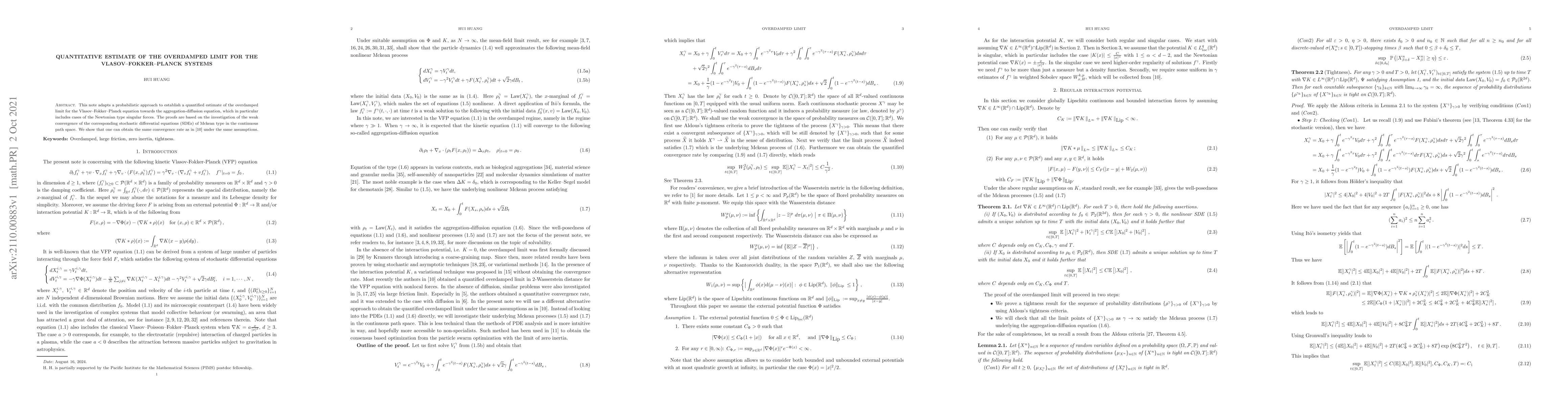 This note adapts a probabilistic approach to establish a quantified estimate of the overdamped limit for the Vlasov-Fokker-Planck equation towards the aggregation-diffusion equation, which in particular includes cases of the Newtonian type singular forces. The proofs are based on the investigation of the weak convergence of the corresponding stochastic differential equations (SDEs) of Mckean type in the continuous path space. We show that one can obtain the same convergence rate as in [10] under the same assumptions.