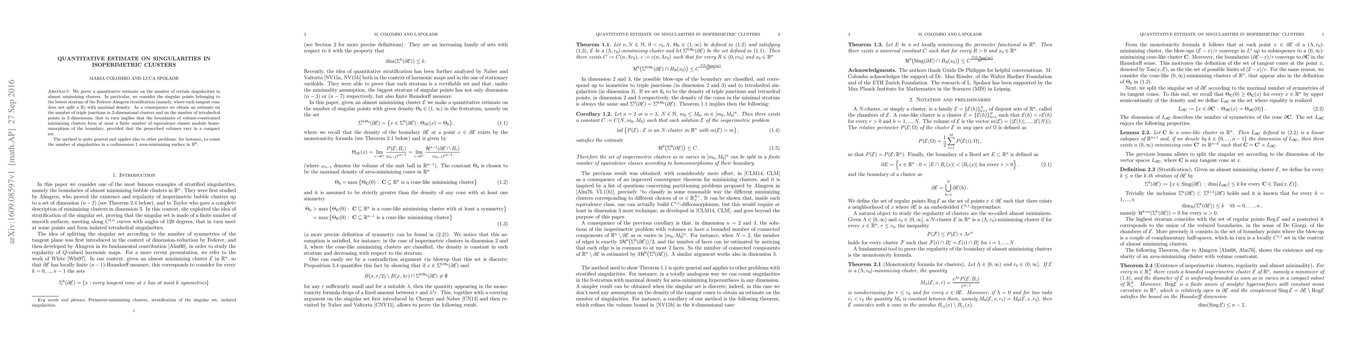 We prove a quantitative estimate on the number of certain singularities in almost minimizing clusters. In particular, we consider the singular points belonging to the lowest stratum of the Federer-Almgren stratification (namely, where each tangent cone does not split a $\R$) with maximal density. As a consequence we obtain an estimate on the number of triple junctions in $2$-dimensional clusters and on the number of tetrahedral points in $3$ dimensions, that in turn implies that the boundaries of volume-constrained minimizing clusters form at most a finite number of equivalence classes modulo homeomorphism of the boundary, provided that the prescribed volumes vary in a compact set. The method is quite general and applies also to other problems: for instance, to count the number of singularities in a codimension 1 area-minimizing surface in $\R^8$.