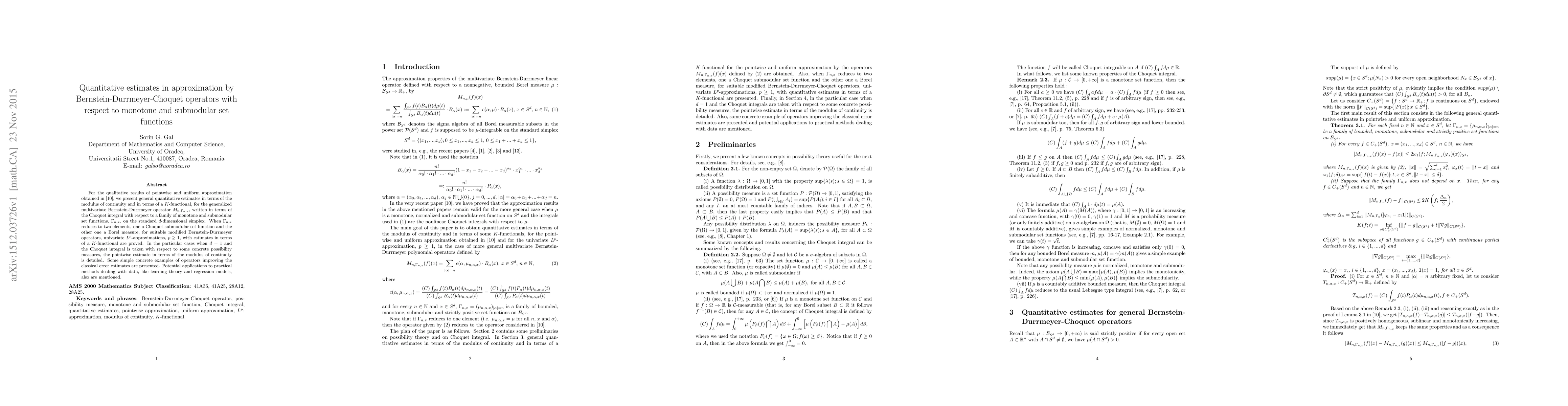 This paper provides quantitative estimates for the approximation quality of generalized Bernstein-Durrmeyer operators using the Choquet integral with respect to monotone and submodular set functions. It details $L^{p}$-approximations and pointwise estimates, with potential applications in learning theory and regression models.