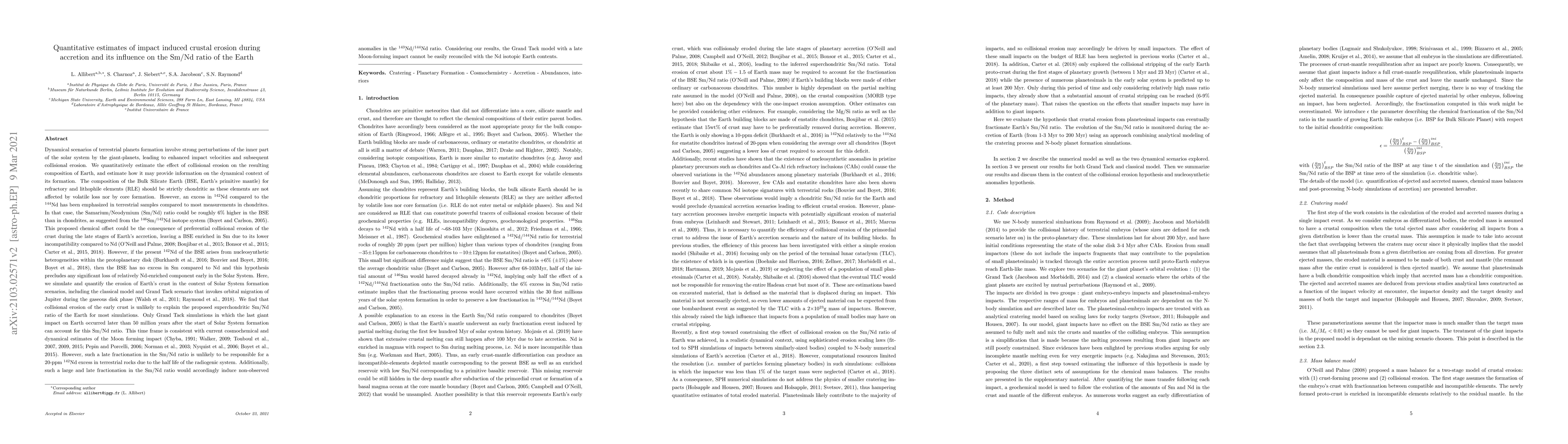 This paper quantitatively estimates the impact of collisional erosion during Earth's accretion and its influence on the Sm/Nd ratio, finding that only Grand Tack scenarios with a late giant impact can account for a 6% excess in Sm/Nd ratio, but this is inconsistent with observed Nd isotopic anomalies.