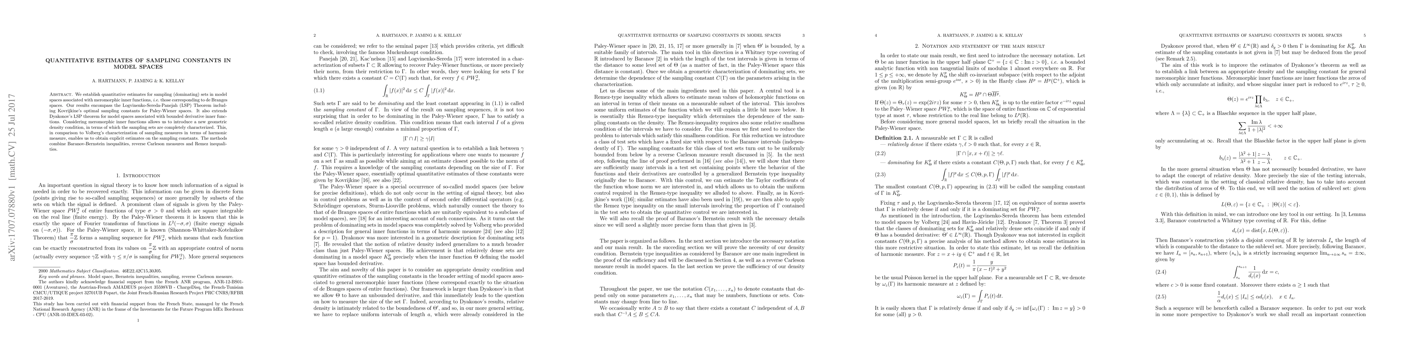 This paper provides quantitative estimates for sampling sets in model spaces linked to meromorphic inner functions, including optimal constants for Paley-Wiener spaces. It introduces a new geometric density condition for characterizing sampling sets, leading to explicit estimates on sampling constants using Baranov-Bernstein inequalities, reverse Carleson measures, and Remez inequalities.
