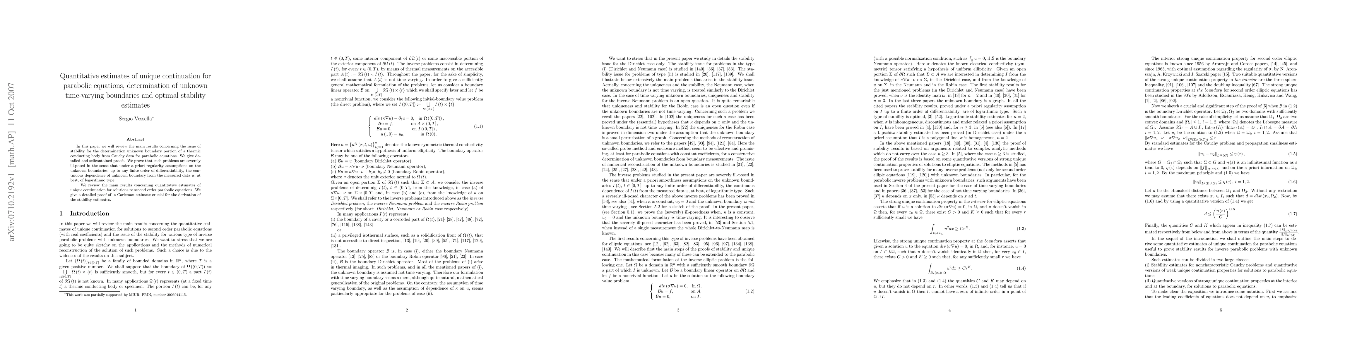 In this paper we will review the main results concerning the issue of stability for the determination unknown boundary portion of a thermic conducting body from Cauchy data for parabolic equations. We give detailed and selfcontained proofs. We prove that such problems are severely ill-posed in the sense that under a priori regularity assumptions on the unknown boundaries, up to any finite order of differentiability, the continuous dependence of unknown boundary from the measured data is, at best, of logarithmic type.