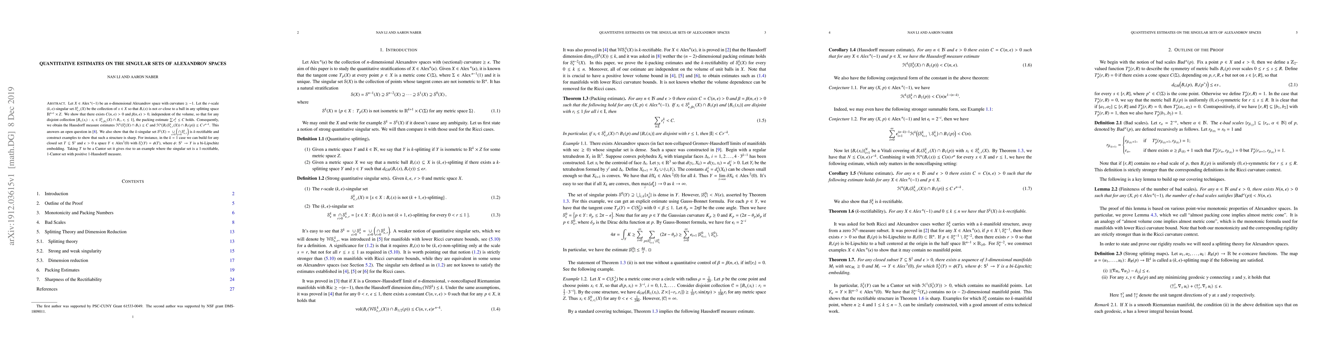 This research paper estimates the size of singular sets in Alexandrov spaces, showing that they can be bounded by a constant independent of volume, with implications for Hausdorff measure estimates and the construction of specific examples.