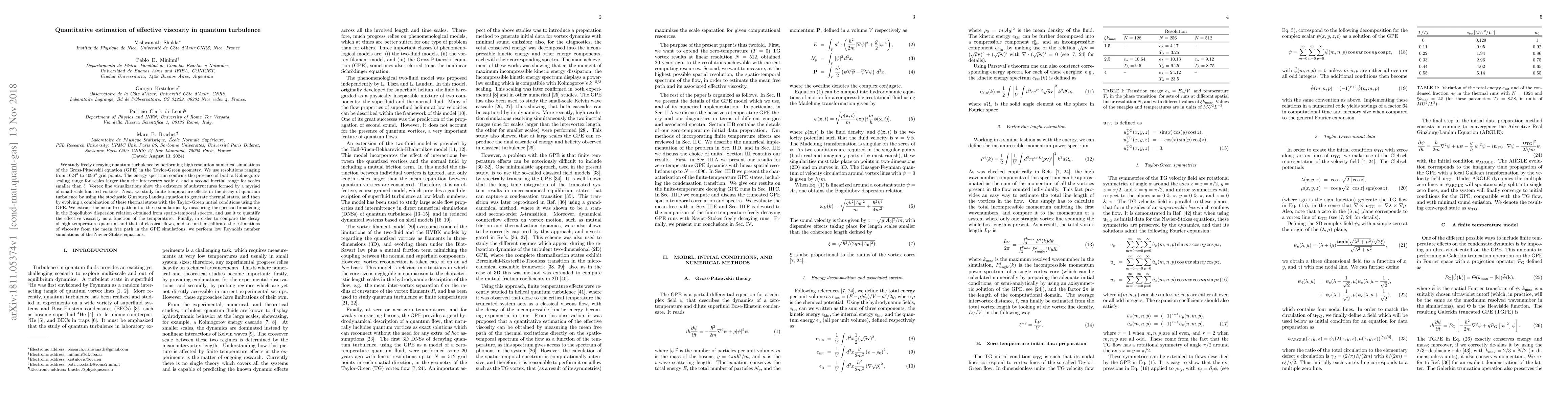 We study freely decaying quantum turbulence by performing high resolution numerical simulations of the Gross-Pitaevskii equation (GPE) in the Taylor-Green geometry. We use resolutions ranging from $1024^3$ to $4096^3$ grid points. The energy spectrum confirms the presence of both a Kolmogorov scaling range for scales larger than the intervortex scale $\ell$, and a second inertial range for scales smaller than $\ell$. Vortex line visualizations show the existence of substructures formed by a myriad of small-scale knotted vortices. Next, we study finite temperature effects in the decay of quantum turbulence by using the stochastic Ginzburg-Landau equation to generate thermal states, and then by evolving a combination of these thermal states with the Taylor-Green initial conditions using the GPE. We extract the mean free path out of these simulations by measuring the spectral broadening in the Bogoliubov dispersion relation obtained from spatio-temporal spectra, and use it to quantify the effective viscosity as a function of the temperature. Finally, in order to compare the decay of high temperature quantum and that of classical flows, and to further calibrate the estimations of viscosity from the mean free path in the GPE simulations, we perform low Reynolds number simulations of the Navier-Stokes equations.
