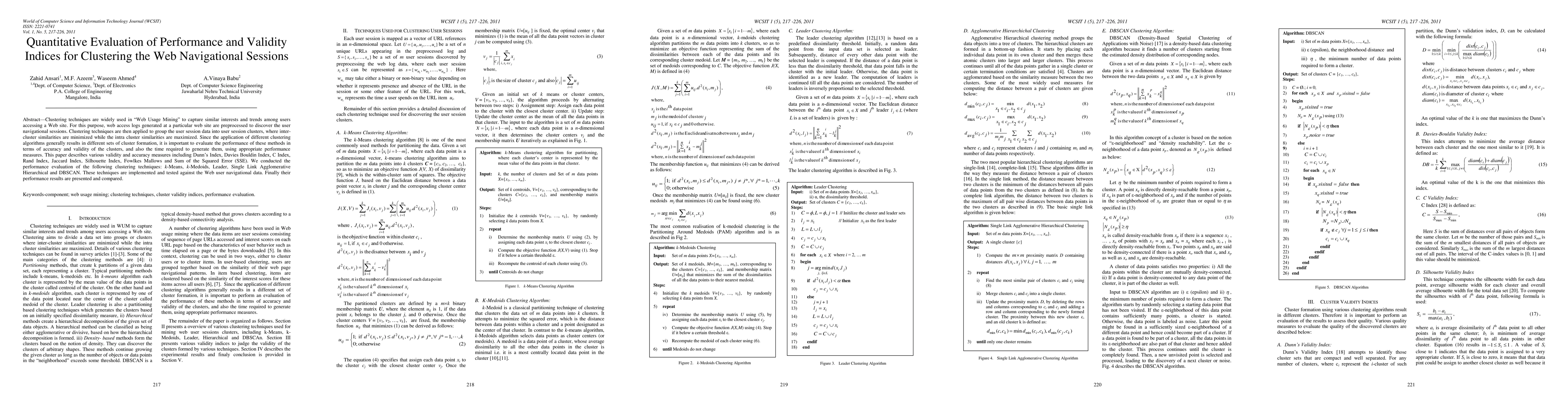 This paper evaluates the performance and validity of various clustering algorithms—k-Means, k-Medoids, Leader, Single Link Agglomerative Hierarchical, and DBSCAN—applied to web navigational session data using multiple measures including Dunn's Index and Davies-Bouldin Index. Results compare the accuracy, validity, and computational efficiency of these clustering methods.