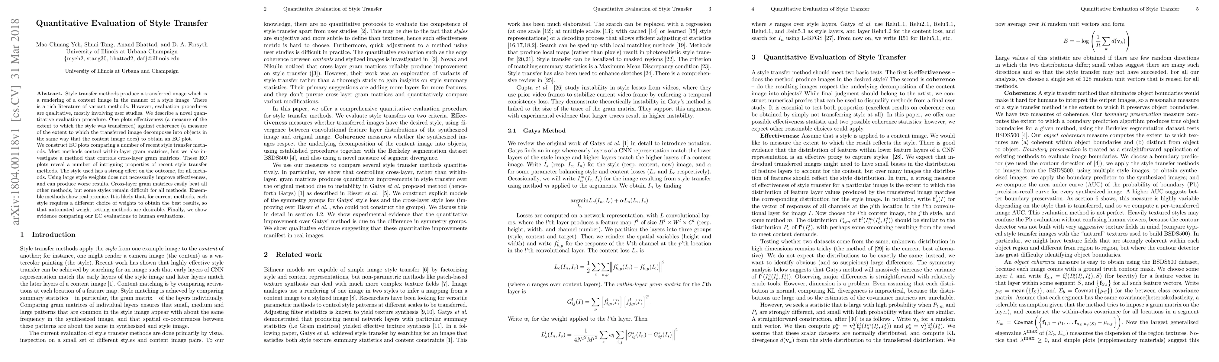 Style transfer methods produce a transferred image which is a rendering of a content image in the manner of a style image. There is a rich literature of variant methods. However, evaluation procedures are qualitative, mostly involving user studies. We describe a novel quantitative evaluation procedure. One plots effectiveness (a measure of the extent to which the style was transferred) against coherence (a measure of the extent to which the transferred image decomposes into objects in the same way that the content image does) to obtain an EC plot. We construct EC plots comparing a number of recent style transfer methods. Most methods control within-layer gram matrices, but we also investigate a method that controls cross-layer gram matrices. These EC plots reveal a number of intriguing properties of recent style transfer methods. The style used has a strong effect on the outcome, for all methods. Using large style weights does not necessarily improve effectiveness, and can produce worse results. Cross-layer gram matrices easily beat all other methods, but some styles remain difficult for all methods. Ensemble methods show real promise. It is likely that, for current methods, each style requires a different choice of weights to obtain the best results, so that automated weight setting methods are desirable. Finally, we show evidence comparing our EC evaluations to human evaluations.