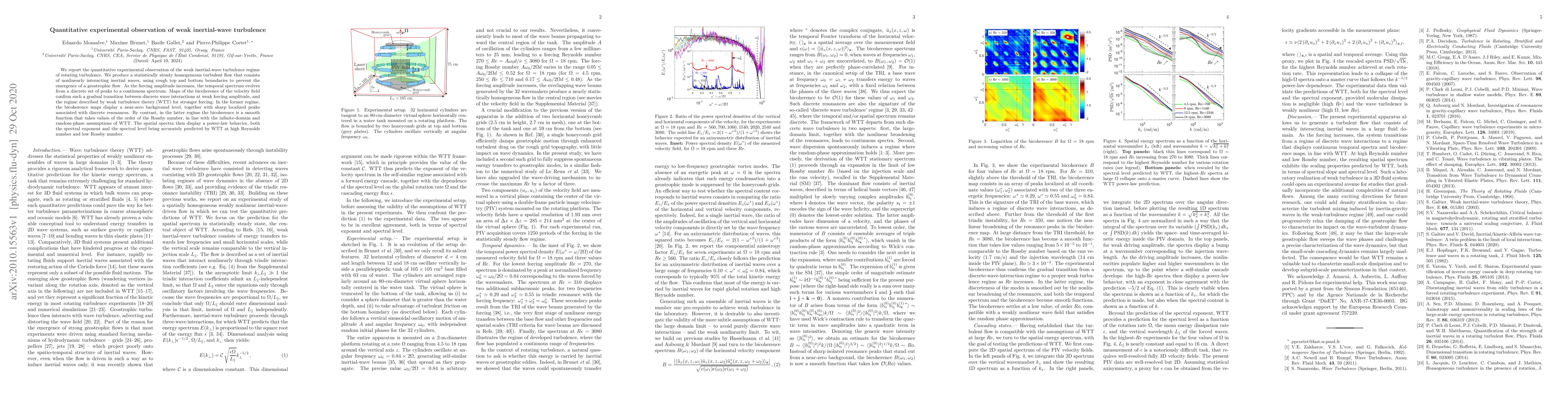 This paper reports on the experimental observation of weak inertial-wave turbulence in rotating flows, showing a transition from discrete wave interactions to a continuous spectrum as forcing increases. The bicoherence maps and spatial spectra align with weak turbulence theory predictions at high Reynolds number and low Rossby number.