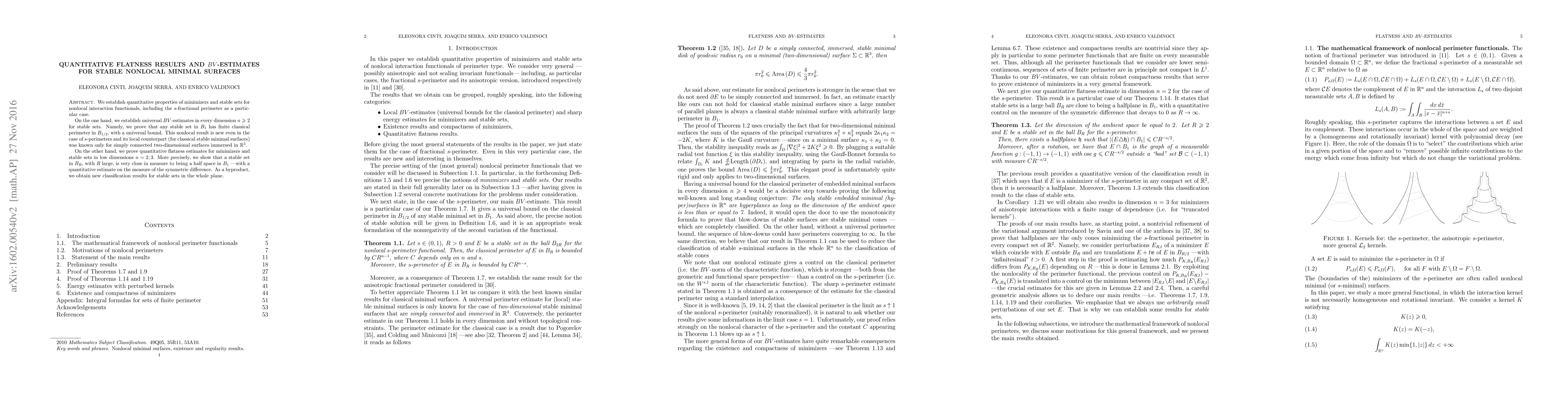 The research extends known results for stable minimal surfaces to the nonlocal setting, providing new $BV$-estimates and quantitative flatness results that are novel even for the case of $s$-perimeters and their local counterparts.