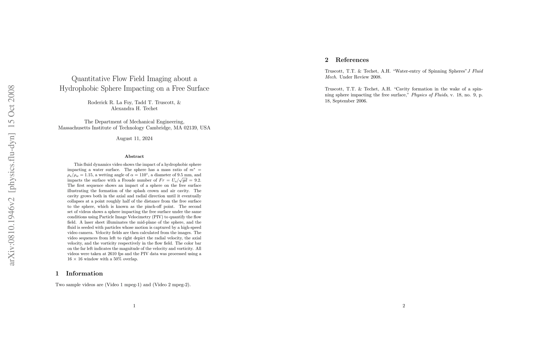 This fluid dynamics video shows the impact of a hydrophobic sphere impacting a water surface. The sphere has a mass ratio of m* = 1.15, a wetting angle of 110 degrees, a diameter of 9.5 mm, and impacts the surface with a Froude number of Fr = 9.2. The first sequence shows an impact of a sphere on the free surface illustrating the formation of the splash crown and air cavity. The cavity grows both in the axial and radial direction until it eventually collapses at a point roughly half of the distance from the free surface to the sphere, which is known as the pinch-off point. The second set of videos shows a sphere impacting the free surface under the same conditions using Particle Image Velocimetry (PIV) to quantify the flow field. A laser sheet illuminates the mid-plane of the sphere, and the fluid is seeded with particles whose motion is captured by a high-speed video camera. Velocity fields are then calculated from the images. The video sequences from left to right depict the radial velocity, the axial velocity, and the vorticity respectively in the flow field. The color bar on the far left indicates the magnitude of the velocity and vorticity. All videos were taken at 2610 fps and the PIV data was processed using a 16 x 16 window with a 50% overlap.