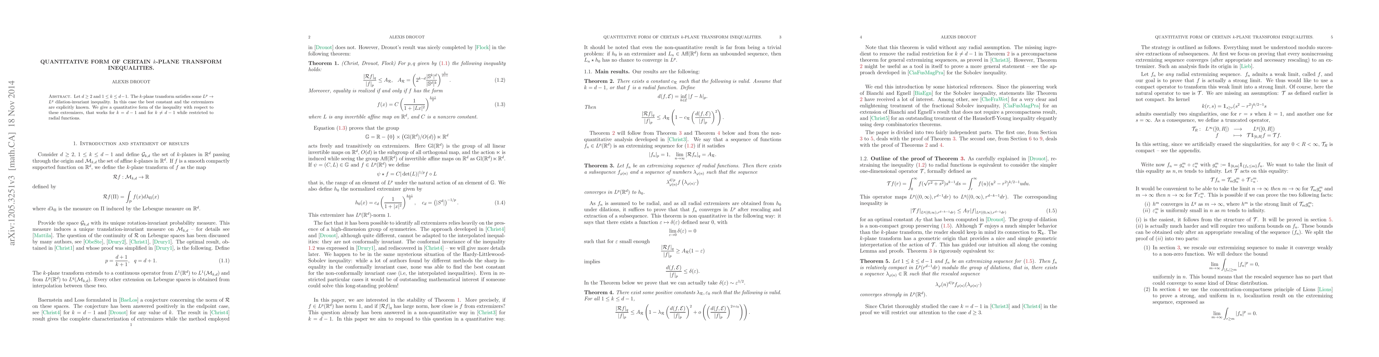 This paper presents a quantitative form of k-plane transform inequalities for dimensions d > 1 and 0 < k < d, focusing on the best constant and extremizers. It specifically addresses the case when k = d - 1 and k < d - 1, with results restricted to radial functions.