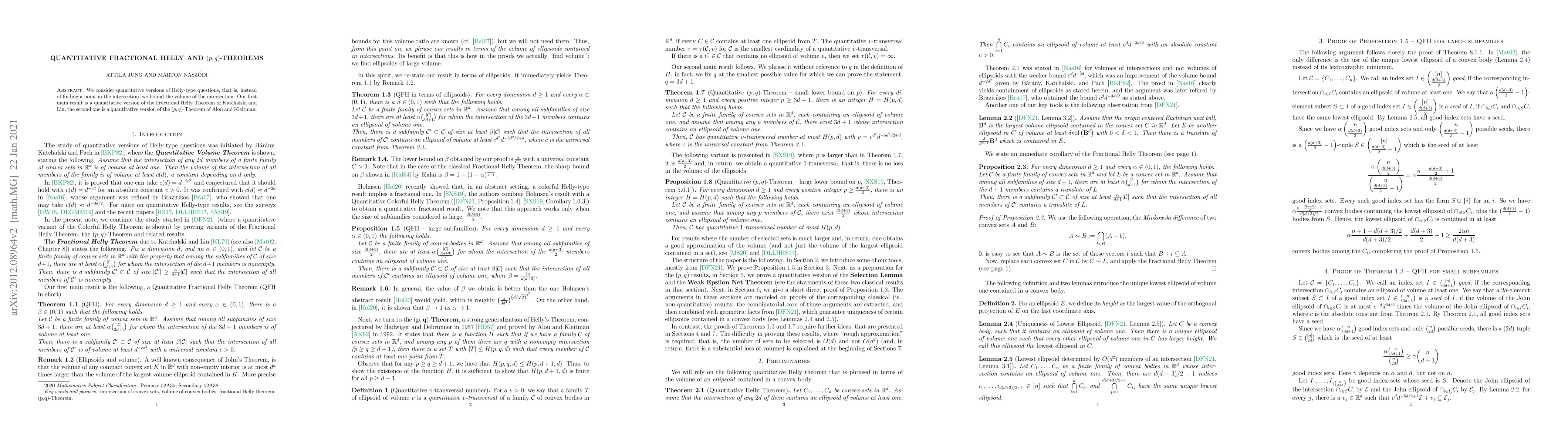 This paper develops quantitative versions of geometric theorems, specifically a fractional Helly theorem and a (p,q)-theorem, to bound the volume of intersections instead of finding exact points.