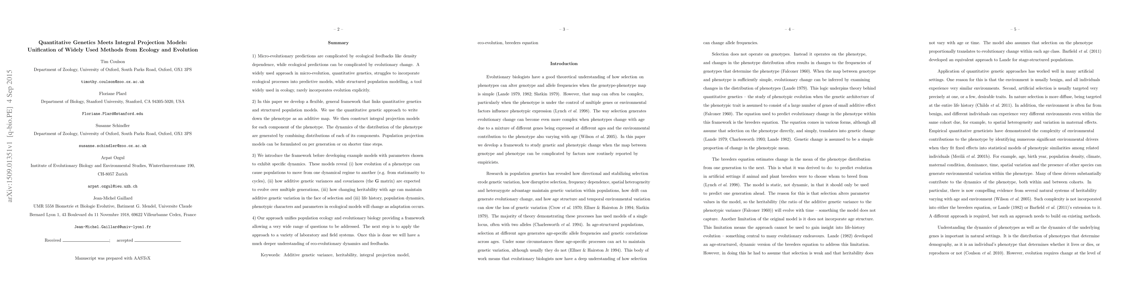 This paper develops a unified framework combining quantitative genetics with integral projection models to better predict micro-evolutionary and ecological dynamics. It shows how evolutionary changes can shift population dynamics and how the G matrix evolves, providing a powerful tool for understanding eco-evolutionary feedbacks.