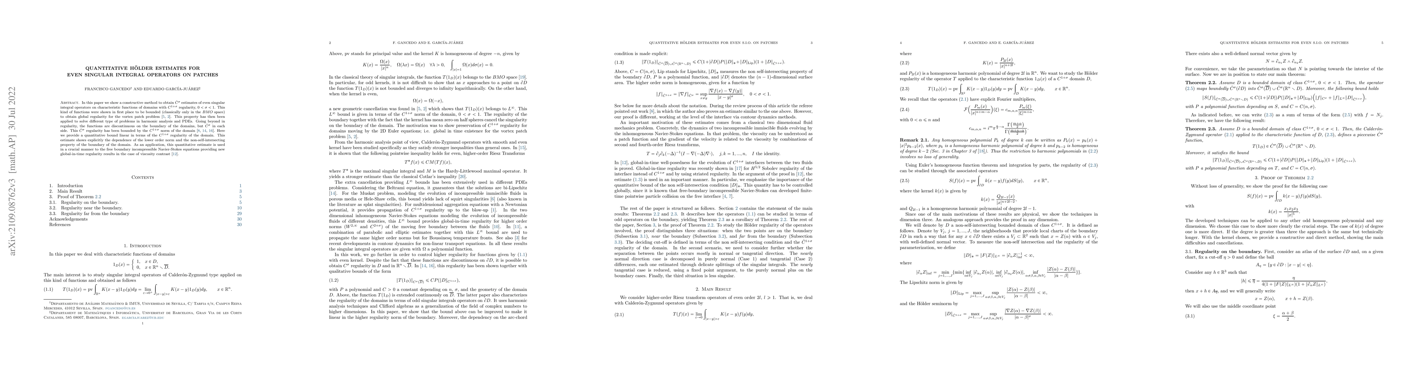 In this paper we show a constructive method to obtain $\dot{C}^\sigma$ estimates of even singular integral operators on characteristic functions of domains with $C^{1+\sigma}$ regularity, $0<\sigma<1$. This kind of functions were shown in first place to be bounded (classically only in the $BMO$ space) to obtain global regularity for the vortex patch problem [5, 2]. This property has then been applied to solve different type of problems in harmonic analysis and PDEs. Going beyond in regularity, the functions are discontinuous on the boundary of the domains, but $\dot{C}^{\sigma}$ in each side. This $\dot{C}^{\sigma}$ regularity has been bounded by the $C^{1+\sigma}$ norm of the domain [8, 14, 16]. Here we provide a quantitative bound linear in terms of the $C^{1+\sigma}$ regularity of the domain. This estimate shows explicitly the dependence of the lower order norm and the non-self-intersecting property of the boundary of the domain. As an application, this quantitative estimate is used in a crucial manner to the free boundary incompressible Navier-Stokes equations providing new global-in-time regularity results in the case of viscosity contrast [12].